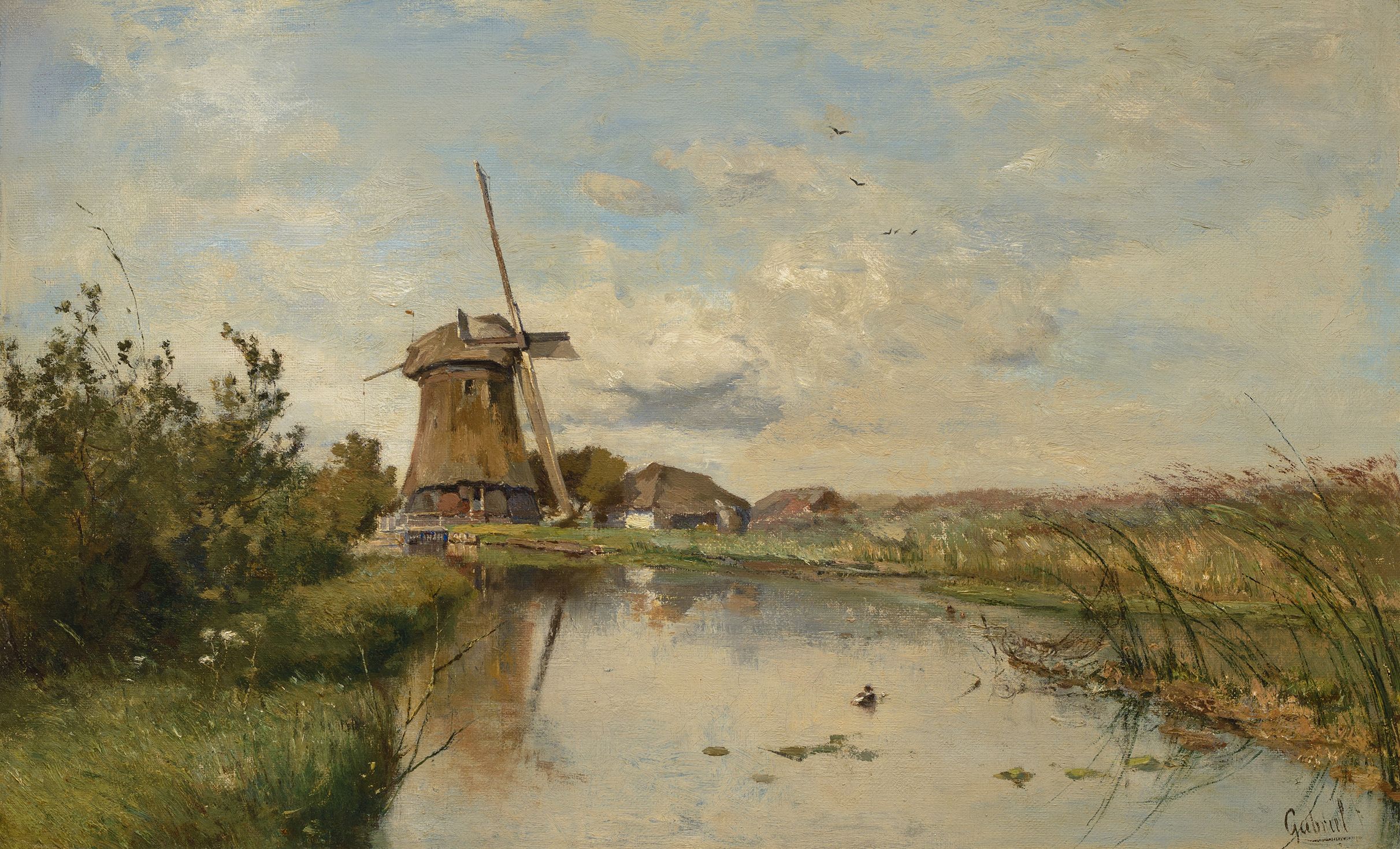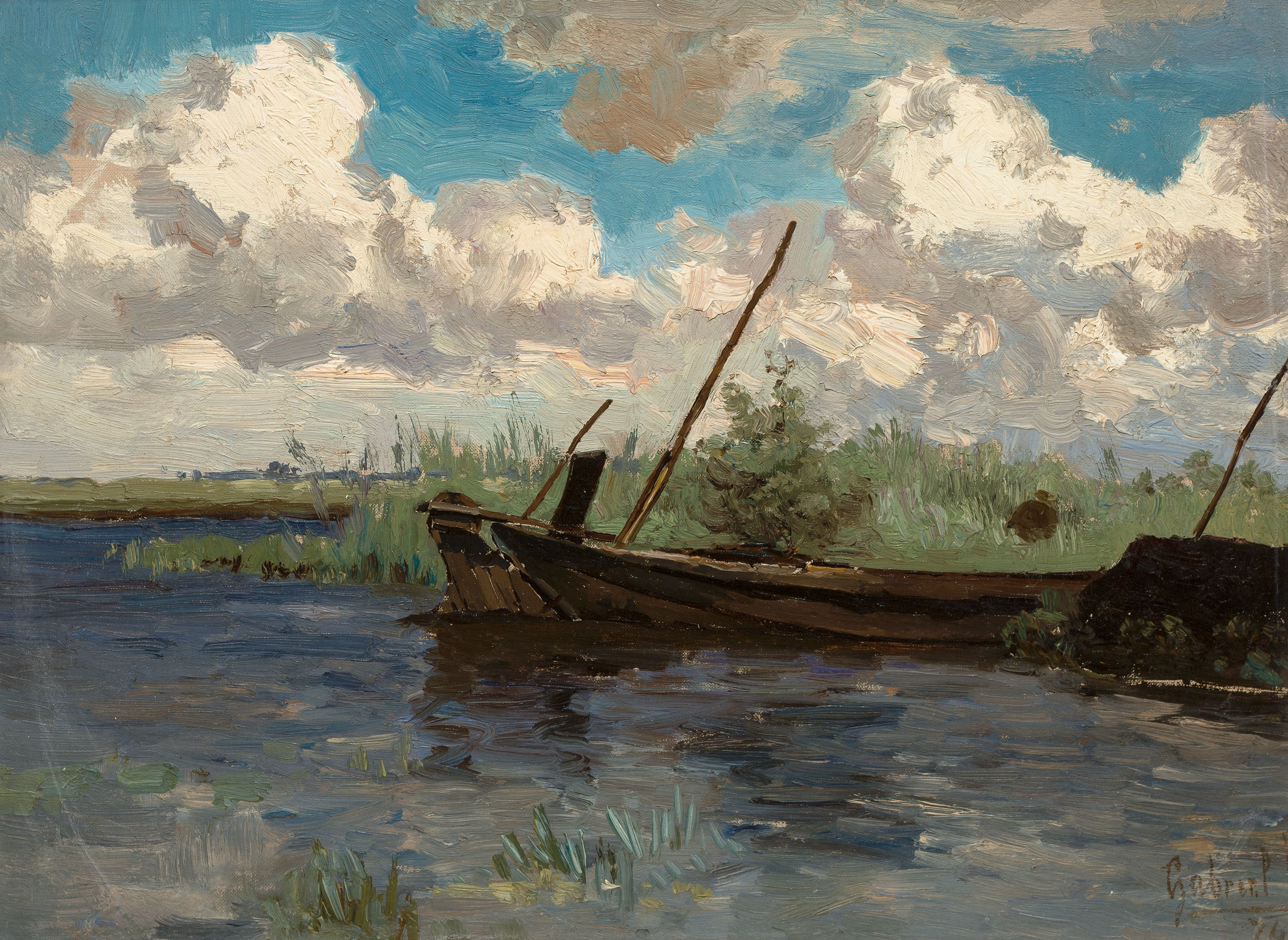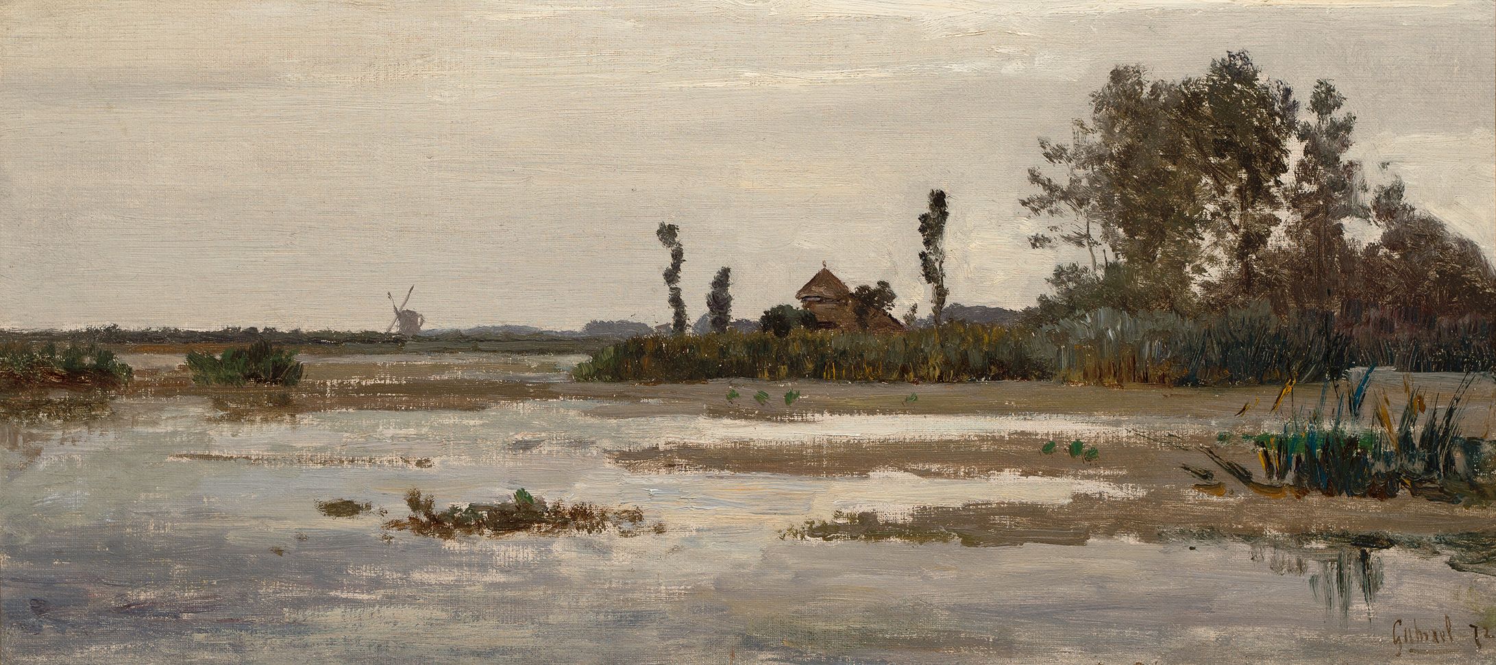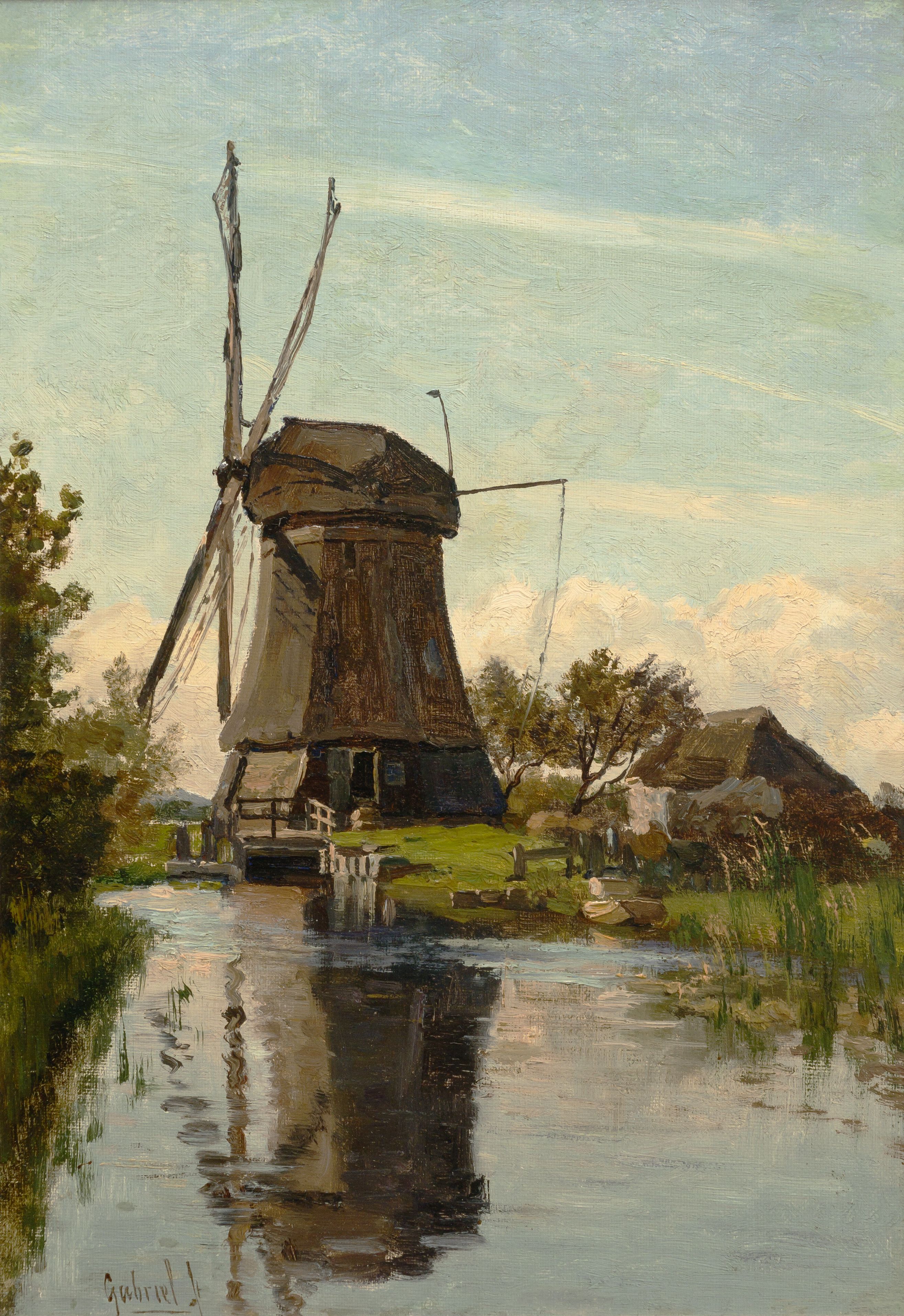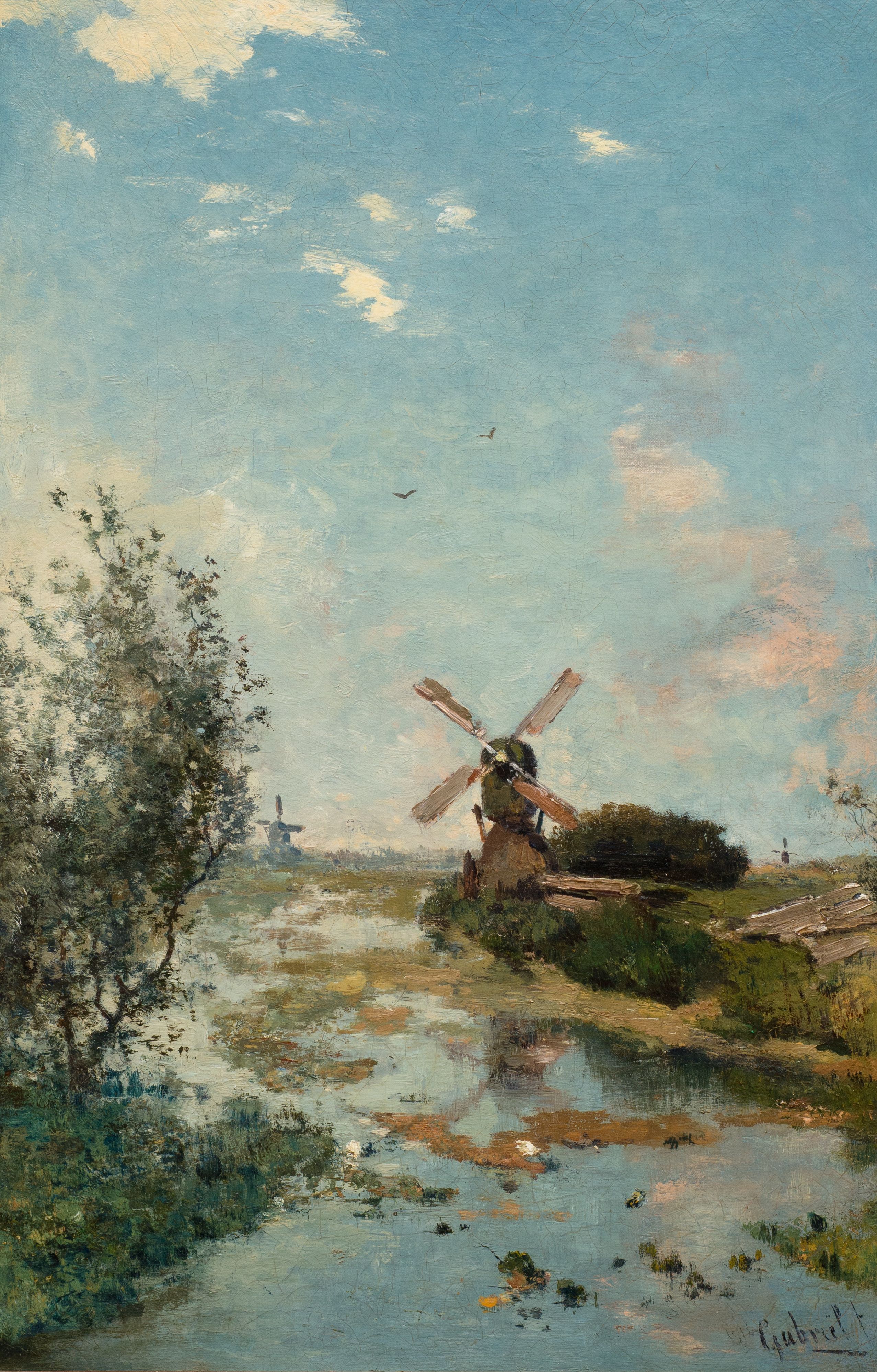 Paul Gabriel is pre-eminently characterized as the portraitist of the Dutch polder. He learned to paint en-plein-air in Oosterbeek, where he spent some time with J.W. Bilders, among others. In 1860 he moved to Brussels where he became friends with Willem Roelofs, the leading landscape painter at the time. From Brussels he regularly returned to paint the Dutch ponds and polders. The time of day (preferably early in the morning) and the corresponding light are important elements in Gabriel's work. In doing so, he uses more than just the nuances of gray so beloved of his contemporaries and was thus called the colorist of the Hague School. Mesdag calls it "Gabriel's morning poetry." Until the 1980s, Gabriel painted mainly in the area around Kortenhoef, Abcoude and Vreeland. After moving to Scheveningen in 1884, he works in the area around The Hague. Gabriel belongs to one of the leading painters of the Hague School. Almost all important museums own work by him.
