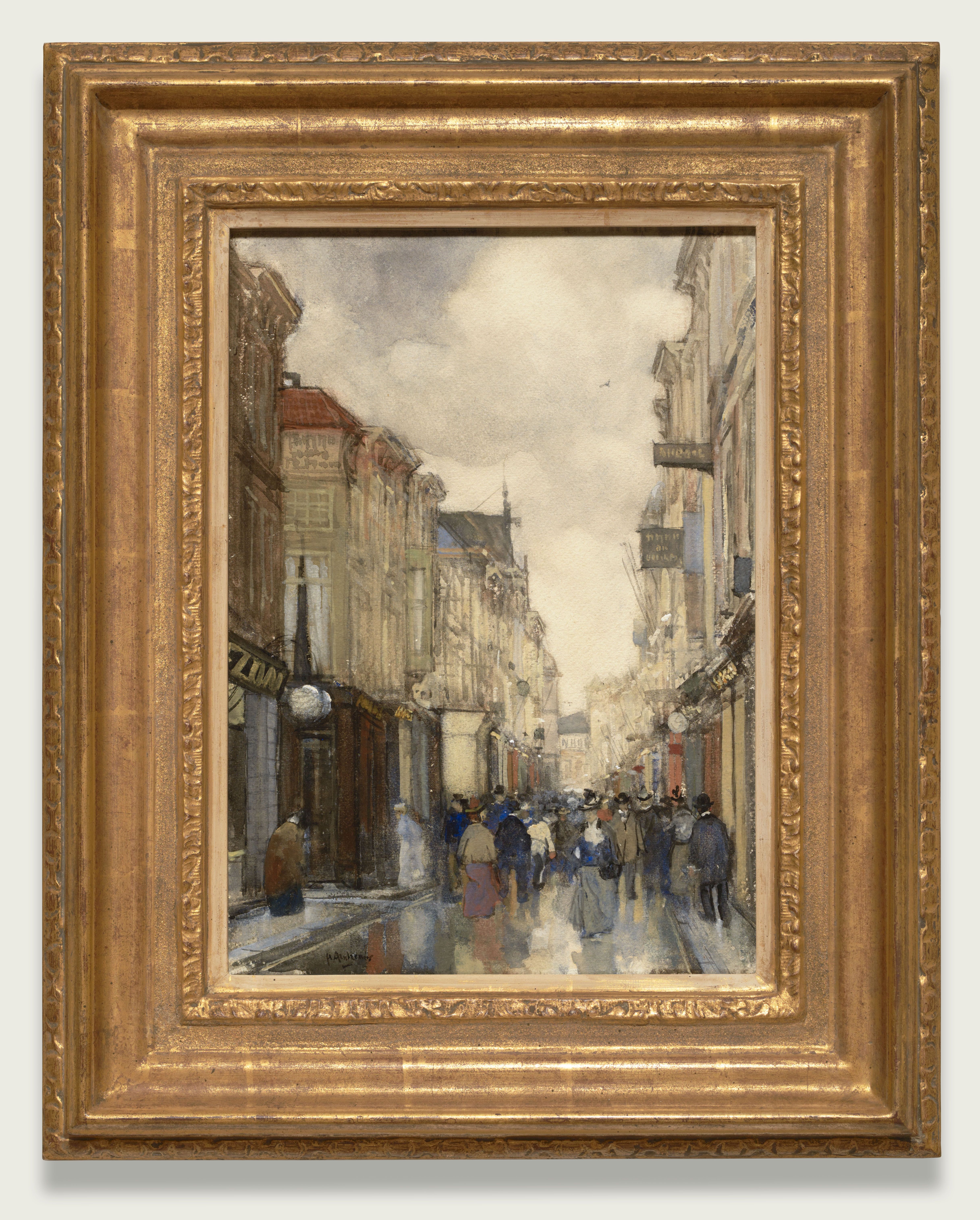 Floris Arntzenius, “Flor” voor zijn vrienden bracht de eerste tien jaren van zijn leven door in het voormalige Nederlands-Indië. Vervolgens verhuisde hij naar een oom en tante in Amsterdam. In de jaren 1881- 1888 studeerde hij- met enige onderbreking- aan de Rijksacademie in Amsterdam, waar destijds August Allebé (1838-1927) de scepter zwaaide en Flor zijn schilders vrienden George Breitner (1857-1923), Isaac Israels (1865-1914), Jan Veth (1864- 1925) en Willem Witsen (1860-1923) leerde kennen. Arntzenius vervolgde zijn opleiding aan de Antwerpse academie, keerde weer terug naar Amsterdam waar hij zich in 1887 opnieuw bij de Rijksacademie aanmeldde en in 1888 zijn opleiding als voltooid beschouwde. Daarna volgde een periode van reizen; zo was hij o.a. in 1890 in New York. In 1892 vestigde hij zich definitief in Den Haag, waar hij tot zijn overlijden in 1925 zou blijven wonen en werken. Hij werd lid van de Amsterdamse kunstenaarsvereniging Arti et Amicitiae en in Den Haag van Pulchri Studio. In 1896 aanvaarde hij het lidmaatschap van de Hollandsche Teekenmaatschappij, waarvan hij een prominent medewerker zou worden. Passend in zijn tijd aquarelleerde Arntzenius en blonk daarin ook uit. Tot aan zijn dood zou Arntzenius trouw blijven aan zijn onderwerpen en schilderstijl. De nieuwe richtingen die sinds het begin van de 20ste eeuw kunstenaars als Kees van Dongen (1877-1968), Jan Sluijters (1881-1957) en Leo Gestel (1881-1941) insloegen, inspireerden Arntzenius niet tot navolging en hij maakte daar ook geen probleem van. In 1920 vulde hij op verzoek van de Larense kunsthandel N. van Harpen een vragenlijst in onder andere over zijn kunstrichting. Laconiek antwoordde hij: ”Volgens deze tijd is mijn kunstrichting niet de goede”. De kwaliteit van zijn werk, de subtiele sfeer van zijn straattaferelen zijn echter tijdloos; de “straatjes” weten nog altijd te boeien en vormen een gewild verzamelobject voor de fijnproevers.