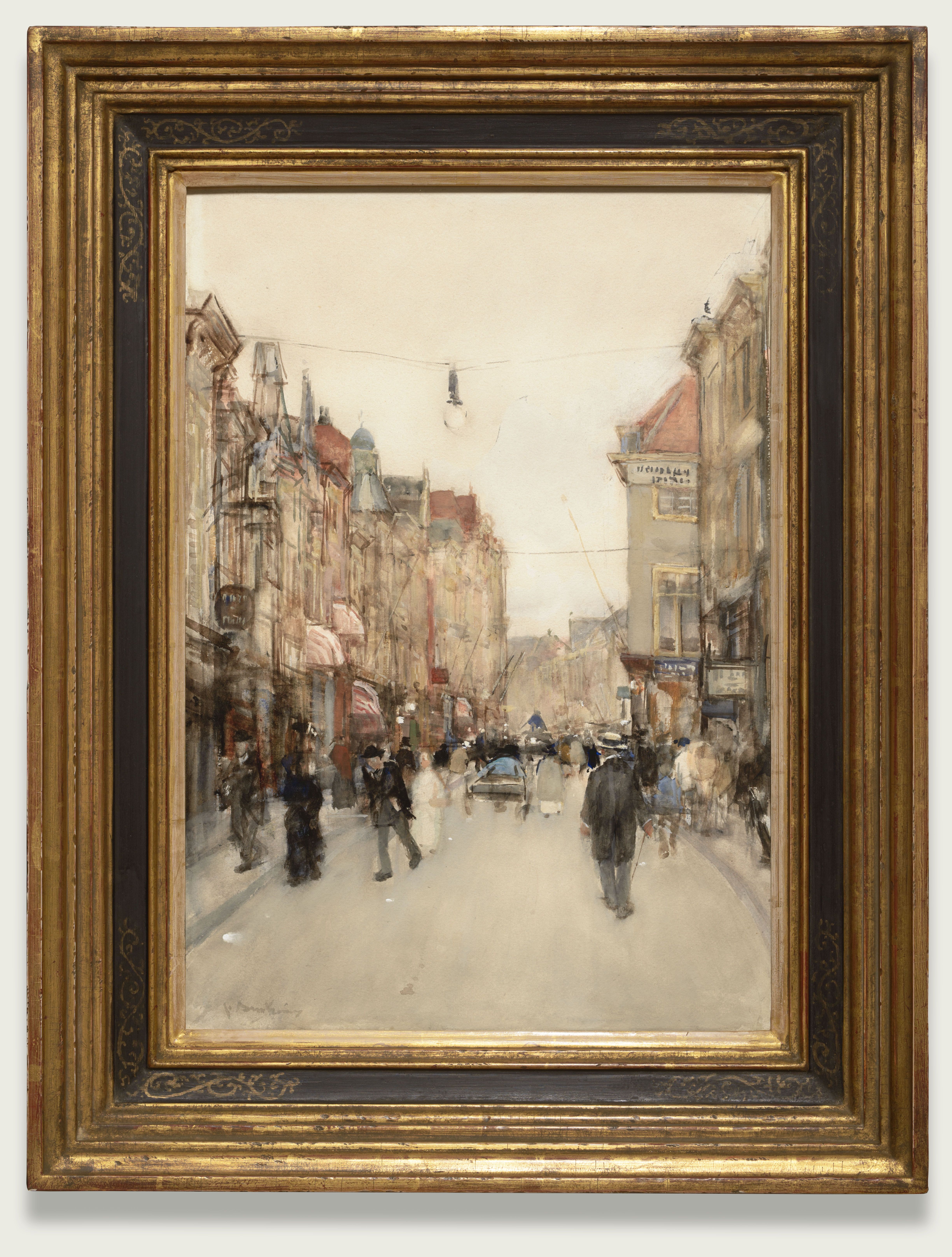 Floris Arntzenius, “Flor” voor zijn vrienden bracht de eerste tien jaren van zijn leven door in het voormalige Nederlands-Indië. Vervolgens verhuisde hij naar een oom en tante in Amsterdam. In de jaren 1881- 1888 studeerde hij- met enige onderbreking- aan de Rijksacademie in Amsterdam, waar destijds August Allebé (1838-1927) de scepter zwaaide en Flor zijn schilders vrienden George Breitner (1857-1923), Isaac Israels (1865-1914), Jan Veth (1864- 1925) en Willem Witsen (1860-1923) leerde kennen. Arntzenius vervolgde zijn opleiding aan de Antwerpse academie, keerde weer terug naar Amsterdam waar hij zich in 1887 opnieuw bij de Rijksacademie aanmeldde en in 1888 zijn opleiding als voltooid beschouwde. Daarna volgde een periode van reizen; zo was hij o.a. in 1890 in New York. In 1892 vestigde hij zich definitief in Den Haag, waar hij tot zijn overlijden in 1925 zou blijven wonen en werken. Hij werd lid van de Amsterdamse kunstenaarsvereniging Arti et Amicitiae en in Den Haag van Pulchri Studio. In 1896 aanvaarde hij het lidmaatschap van de Hollandsche Teekenmaatschappij, waarvan hij een prominent medewerker zou worden. Passend in zijn tijd aquarelleerde Arntzenius en blonk daarin ook uit. Tot aan zijn dood zou Arntzenius trouw blijven aan zijn onderwerpen en schilderstijl. De nieuwe richtingen die sinds het begin van de 20ste eeuw kunstenaars als Kees van Dongen (1877-1968), Jan Sluijters (1881-1957) en Leo Gestel (1881-1941) insloegen, inspireerden Arntzenius niet tot navolging en hij maakte daar ook geen probleem van. In 1920 vulde hij op verzoek van de Larense kunsthandel N. van Harpen een vragenlijst in onder andere over zijn kunstrichting. Laconiek antwoordde hij: ”Volgens deze tijd is mijn kunstrichting niet de goede”. De kwaliteit van zijn werk, de subtiele sfeer van zijn straattaferelen zijn echter tijdloos; de “straatjes” weten nog altijd te boeien en vormen een gewild verzamelobject voor de fijnproevers.