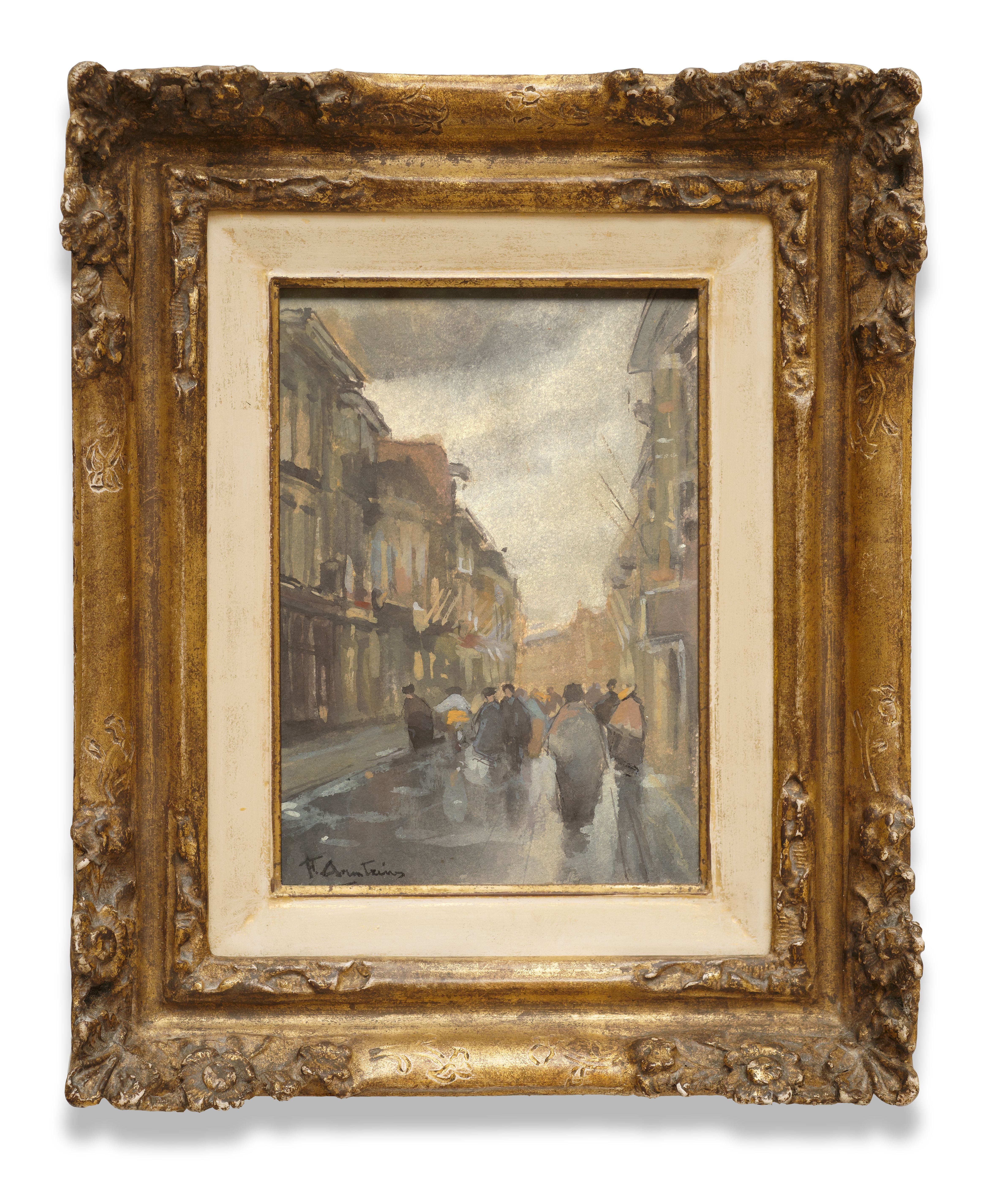 Floris Arntzenius, “Flor” voor zijn vrienden bracht de eerste tien jaren van zijn leven door in het voormalige Nederlands-Indië. Vervolgens verhuisde hij naar een oom en tante in Amsterdam. In de jaren 1881- 1888 studeerde hij- met enige onderbreking- aan de Rijksacademie in Amsterdam, waar destijds August Allebé (1838-1927) de scepter zwaaide en Flor zijn schilders vrienden George Breitner (1857-1923), Isaac Israels (1865-1914), Jan Veth (1864- 1925) en Willem Witsen (1860-1923) leerde kennen. Arntzenius vervolgde zijn opleiding aan de Antwerpse academie, keerde weer terug naar Amsterdam waar hij zich in 1887 opnieuw bij de Rijksacademie aanmeldde en in 1888 zijn opleiding als voltooid beschouwde. Daarna volgde een periode van reizen; zo was hij o.a. in 1890 in New York. In 1892 vestigde hij zich definitief in Den Haag, waar hij tot zijn overlijden in 1925 zou blijven wonen en werken. Hij werd lid van de Amsterdamse kunstenaarsvereniging Arti et Amicitiae en in Den Haag van Pulchri Studio. In 1896 aanvaarde hij het lidmaatschap van de Hollandsche Teekenmaatschappij, waarvan hij een prominent medewerker zou worden. Passend in zijn tijd aquarelleerde Arntzenius en blonk daarin ook uit. Tot aan zijn dood zou Arntzenius trouw blijven aan zijn onderwerpen en schilderstijl. De nieuwe richtingen die sinds het begin van de 20ste eeuw kunstenaars als Kees van Dongen (1877-1968), Jan Sluijters (1881-1957) en Leo Gestel (1881-1941) insloegen, inspireerden Arntzenius niet tot navolging en hij maakte daar ook geen probleem van. In 1920 vulde hij op verzoek van de Larense kunsthandel N. van Harpen een vragenlijst in onder andere over zijn kunstrichting. Laconiek antwoordde hij: ”Volgens deze tijd is mijn kunstrichting niet de goede”. De kwaliteit van zijn werk, de subtiele sfeer van zijn straattaferelen zijn echter tijdloos; de “straatjes” weten nog altijd te boeien en vormen een gewild verzamelobject voor de fijnproevers.