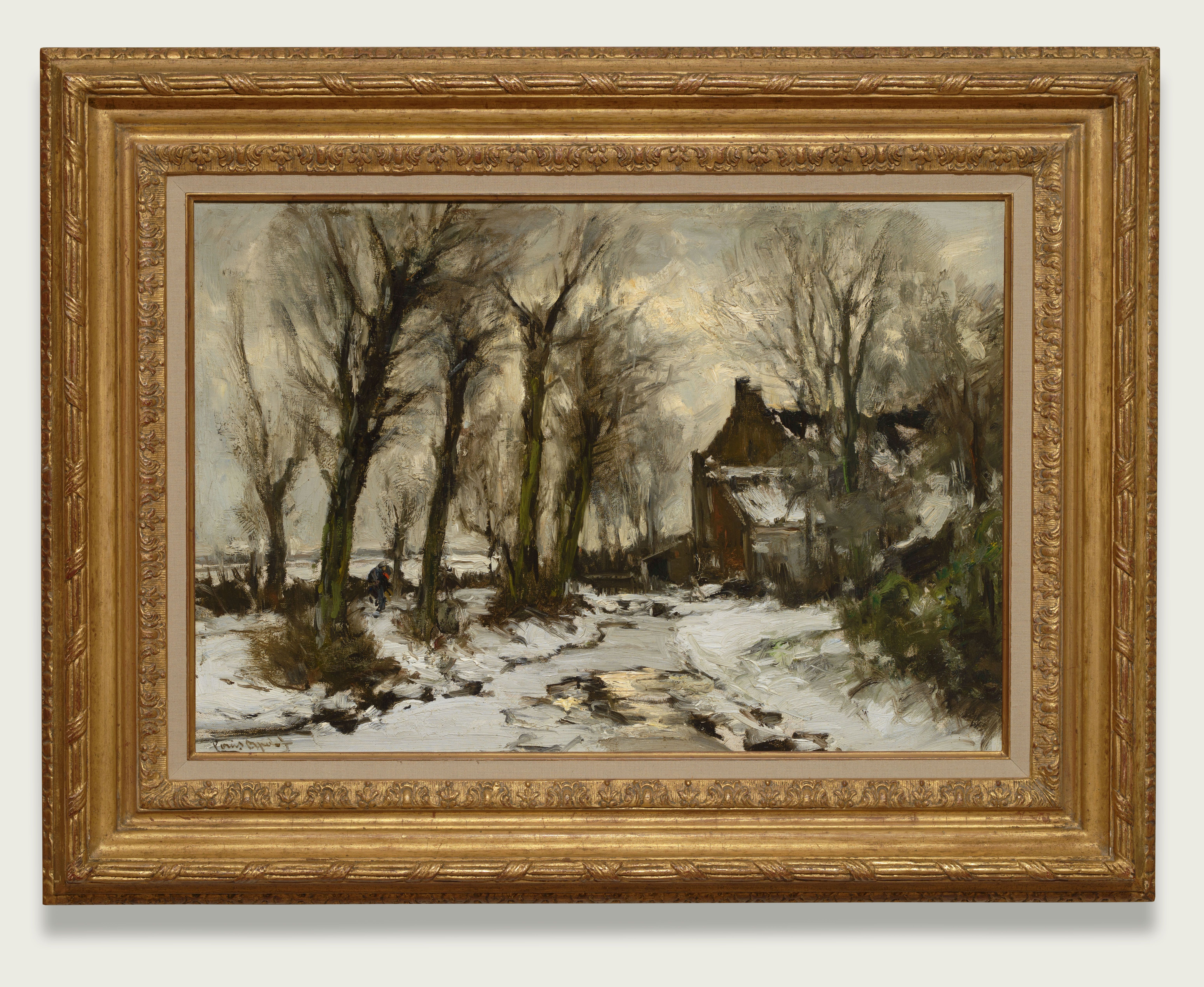 Louis Apol werd in Den Haag geboren en met uitzondering van de jaren 1886 – 1892 die hij in Velp doorbracht, zou hij daar altijd blijven wonen. Als schilder van voornamelijk besneeuwde bosgezichten en landschappen maakte Apol in 1880 deel uit van een wetenschappelijke expeditie naar Nova Zembla op Spitsbergen en kwam ervan terug met een grote hoeveelheid schetsen, tekeningen en aquarellen. Naar aanleiding van deze reis maakte hij een “panorama” van Spitsbergen: zijn schilderingen werden gebruikt als achtergrond voor opgezette ijsberen en zeehonden. Panorama’s waren geliefd bij het grote publiek aan het begin van de 20ste eeuw. Helaas was dit panorama maar tijdelijk en is het weer afgebroken. Met zijn specialisme van winterlandschappen voegde Apol zich bij een oude Hollandse traditie die begon bij Hendrik Averkamp. Apol richtte zich nog meer op de landschappelijke stemming van het beeld; de illusie van koude en weidsheid, van flonkerende of dreigende lucht en sneeuw dan zijn voorgangers. Met zijn licht en zijn brede penseelstreek laat hij mooi Hollands impressionisme zien. Met regelmaat werden zijn winterlandschappen bekroond. Al in de jaren ‘50 van de 19e eeuw trokken kunstenaars, meestal uit Den Haag, naar Oosterbeek om daar in de vrije natuur te gaan schilderen. Hier ontstond een schilderskolonie, in navolging van de schilders in het Franse Barbizon. De kunstenaars wilden een eind maken aan de romantische manier van kijken naar de natuur, door deze zo ‘eerlijk’ mogelijk te benaderen. Ze stelden hun composities niet langer samen in hun atelier, maar legden hun ervaring direct vast, buiten in de natuur. Willem Roelofs, die al eerder in Barbizon was geweest, vestigde zich als een van de eersten in Oosterbeek, gevolgd door Paul Gabriel, Anton Mauve en de broers Maris. Hier legden ze de basis voor een nieuwe stroming in de Nederlandse schilderkunst: de Haagse School. Apol voegde een nieuw facet toe aan die stroming: hij werd de ‘winterschilder’ van de Haagse School. Zijn werk is terug te vinden in verschillende Nederlands musea, de collectie van het Koninklijk Huis en vele particuliere verzamelingen in binnen- en buitenland.