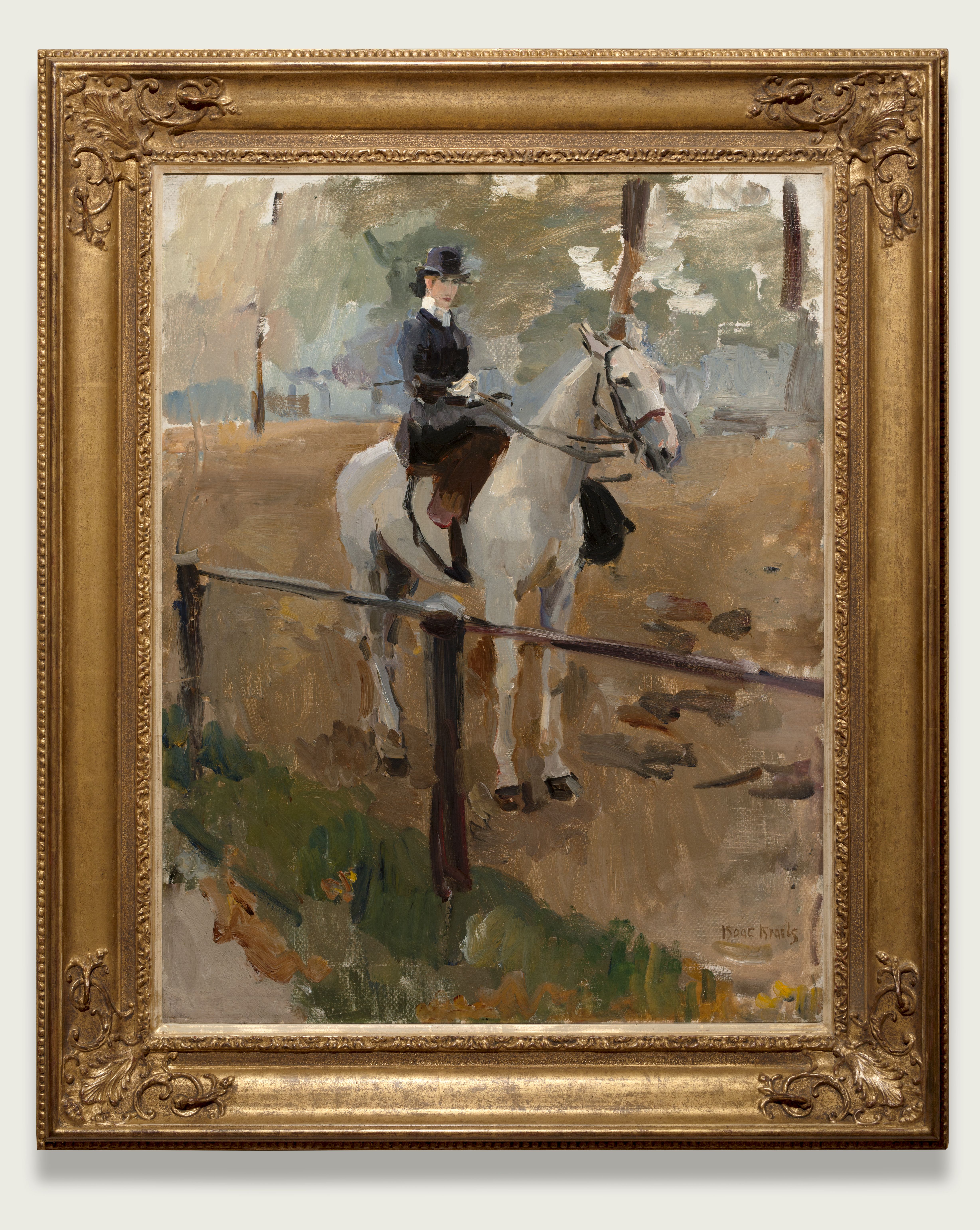Een schilderij uit Londen, waar Isaac Israels in 1913 naar toe was verhuisd. Hij werkte daar vaak in Hyde Park, zoals hij in Parijs graag flanerende mensen in het Bois de Boulogne schilderde, of in Amsterdam in het Oosterpark. In Hyde Park werd hij bijzonder getroffen door de mensen die zich daar vermaakten door op de brede lanen een stukje te gaan paardrijden. Rotten Row, een weg in dat park, word nog altijd gebruikt als ruiterpad, een bijzondere plek voor de betere standen om zich, midden in de drukte van het centrum van Londen, te ontspannen met paardrijden. Ook de afdeling van de Household Cavalry, die optreedt bij ceremoniële gebeurtenissen, traint er zijn paarden. Deze mondaine ontmoetingsplaats voor welgestelde en notabele Londenaren, die daar te paard flaneerden om te zien en gezien te worden, was een plek die een enorme aantrekkingskracht moet hebben gehad op Isaac Israels. Hij maakte er verschillende schilderijen, waar steeds weer zijn opmerkelijke gave om een karakteristiek moment te vangen blijkt. De in het zwart geklede amazone op ons schilderij lijkt een kort moment voor de schilder te poseren. Zij kijkt wat hautain, maar minzaam op ons neer, bewust van de status die haar klasse met zich mee brengt. Zo’n snelle, rake karakteristiek geven was het grote talent van Isaac Israels. Het schilderij is bovendien een portret van de schimmel, die minstens evenveel persoonlijkheid heeft als zijn berijdster. Als bij een portret is de achtergrond vaag gelaten, zonder details, om de aandacht niet af te leiden van de amazone en haar rijdier. Isaac Israels was zijn leven lang een rusteloze reiziger. Dat werd er niet minder op na de dood van zijn wereldberoemde vader in 1911. Isaac woonde in deze tijd in Parijs en twijfelde sterk of hij het huis en atelier van zijn vader in Den Haag moest overnemen. Om die beslissing voor zich uit te schuiven besloot hij eerst nieuwe indrukken op te doen in een stad die hij nog niet goed kende. Hoewel zijn woonplaats Parijs eindeloze mogelijkheden bood, vertrok hij in 1913 naar Londen. Hij huurde een atelier in Fitzroy Street en logeerde in een hotel op Trafalgar Square. In deze nieuwe stad vond hij nieuwe versies van vertrouwde thema’s. Hij schilderde weer mensen die zich vermaken in het park of op straat, hij schilderde balletmeisjes, dames die een pleziertochtje maken op de Theems en ruiters in Hyde Park. Ook het stadsbeeld fascineerde hem. Hij zat graag voorin op de bovenverdieping van een dubbeldekker bus om drukke straten als Regent Street en Piccadilly Circus van boven te bekijken. In Londen maakte hij schilderijen van straten met een hoog standpunt, zoals hij ook al in Amsterdam had gedaan. Een winkelier stelde zijn balkon ter beschikking zodat Isaac daar kon schilderen. Na het uitbreken van de Eerste Wereldoorlog was het echter niet langer toegestaan om op straat te schetsen. Isaac verplaatste dus zijn werk naar binnen, waar hij boksers schilderde in een zaaltje dat hij huurde, compleet met publiek. Ondanks dat de wereldoorlog Europa in brand had gezet reisde Isaac Israels vrij gemakkelijk over het continent. In 1915 ging hij naar Zwitserland, tot verbazing van zijn vrienden. “Isaac is in Bern en schreef mij dat hij naar Parijs zou gaan. Hij weet, geloof ik niet, dat er oorlog is want daar praat hij niet over en ook hoe hij daar denkt te komen, nu Italië ook in oorlog is”, schreef Theo Nieuwenhuis aan Willem Witsen. “Enfin hij is nogal klein misschien merken ze hem niet op.” Israels ging inderdaad even terug naar Parijs waar hij het leven nogal saai vond nu het uitgaansleven door de oorlog stil was komen te liggen. Even later was hij weer terug in Londen, waar hij echter niet lang meer zou blijven. Aan het eind van 1915 was hij weer in Den Haag.