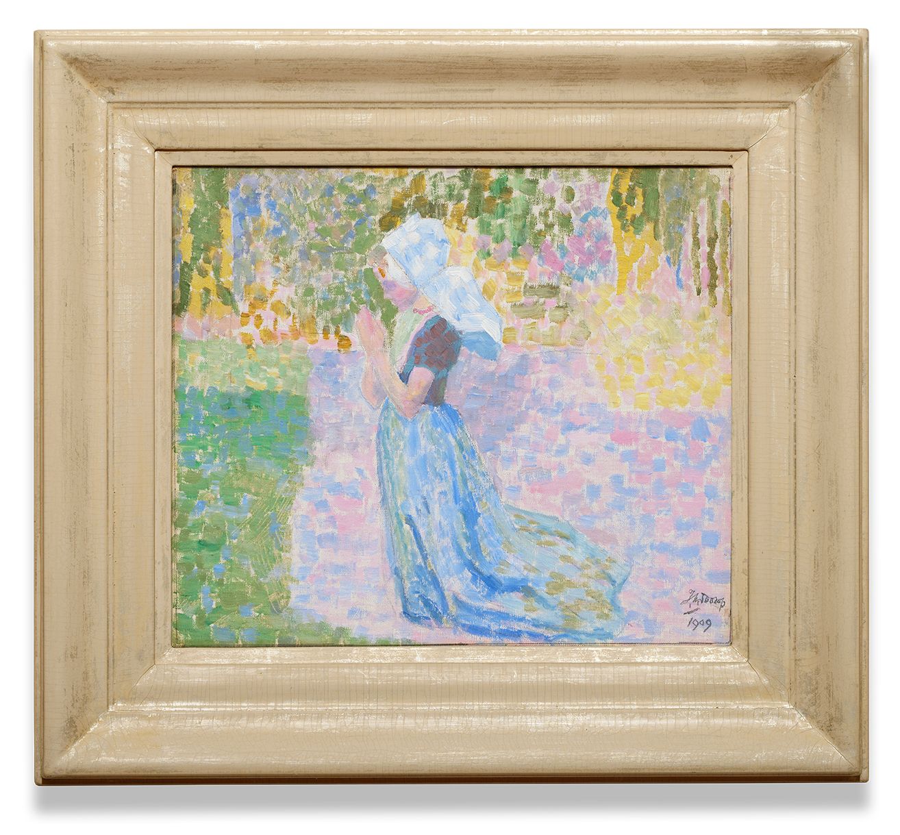 Jan Toorop bracht vanaf 1903 zijn zomers door in Domburg. In zijn kielzog volgden vele kunstenaars en de Zeeuwse badplaats groeide uit tot de zomerse verzamelplaats voor de artistieke avant-garde. Toorop was bijzonder getroffen door het schilderachtige landschap, overgoten door het bijzondere Zeeuwse licht dat hij het beste kon weergeven in een techniek waarbij hij de toetsjes kleur ongemengd naast elkaar op het doek zette. Ons schilderij is typerend voor die vrije, experimentele periode. Uit een mozaïek van kleur komt het onderwerp naar voren: een Zeeuws meisje dat in de buitenlucht op haar knieën zit te bidden. Toorop gaf het schilderijtje de titel Angelus, een katholiek gebed dat driemaal daags gebeden werd en waarvoor het werk even werd onderbroken. Het meisje is echter aan haar klederdracht te herkennen als protestant. Ze draagt een muts met een typerende brede strook aan de achterkant die het haar volledig bedekte. Alleen jonge protestantse meisjes op Walcheren droegen die mutsen.