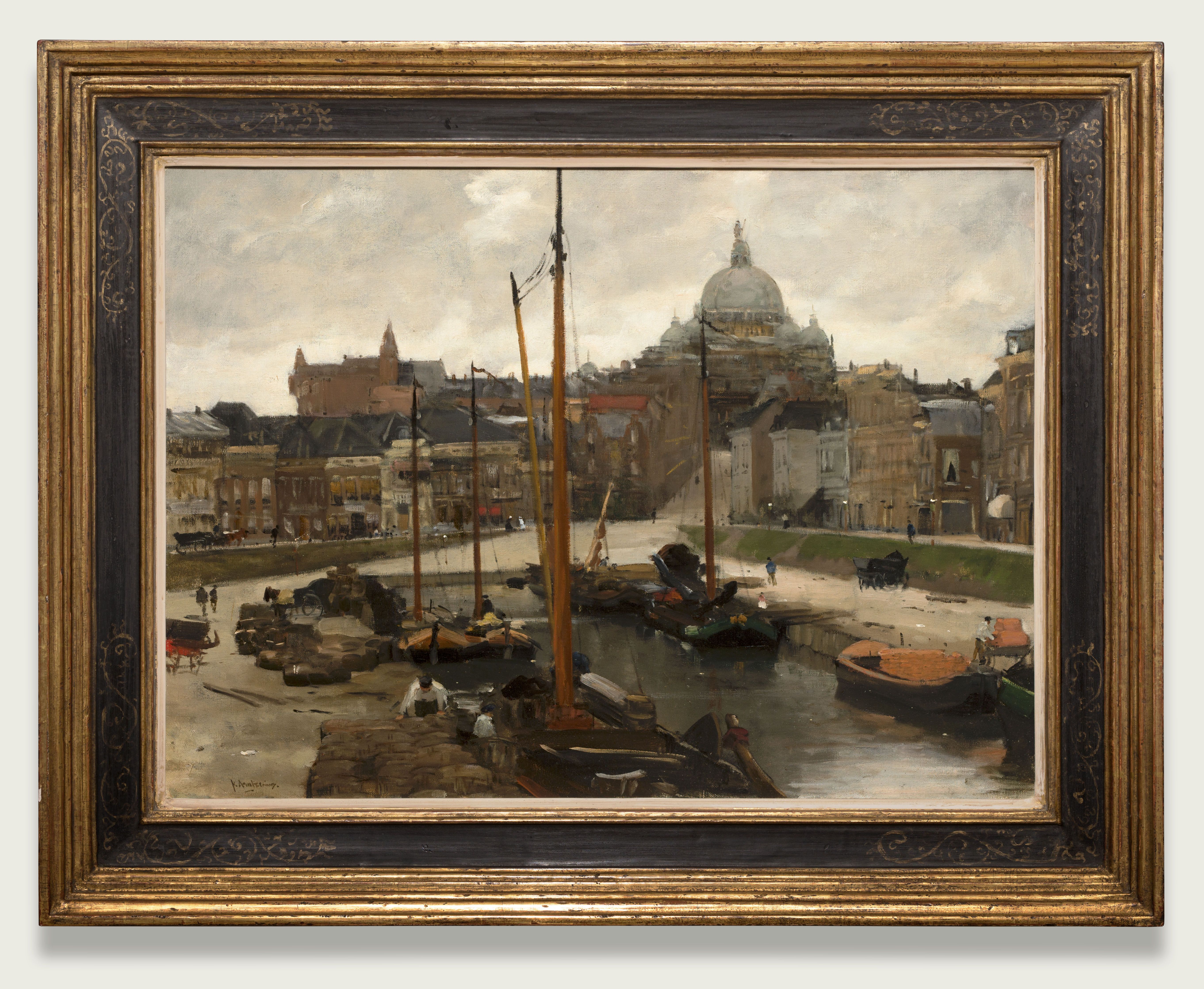 Ook Scheveningen werd voor hem een geliefd onderwerp. Hij schilderde er de badgasten aan het strand, maar ook het dorp zelf had zijn belangstelling. Tussen 1897 en 1910 maakte Arntzenius een aantal schilderijen en aquarellen op de plek van ons schilderij. De combinatie van de bedrijvigheid in het haventje, de ritmiek van de afwisselende huizen en de grote koepels van Restaurant Seinpost tegen de grijze lucht moet hem bijzonder hebben gefascineerd. Arntzenius schilderde graag bij grijs weer. Ook hier zien we weer de kenmerkende, genuanceerd geschilderde loodgrijze lucht, die de stemming van het schilderij bepaalt. Met oneindig veel subtiele kleurnuances bouwde Arntzenius vanuit die grijze grondtonen een charmant en stemmig stadsbeeld op. Kleine kleuraccenten, zoals rode luifels of in het wit geklede figuurtjes verlevendigen het schilderij. Het verdwijnen van dit stukje Scheveningen wordt nog altijd door veel Hagenaars betreurd. Ouderen zullen de plek van het schilderij nog herkennen. Restaurant Seinpost werd in 1976 gesloopt, het haventje werd in dezelfde tijd gedempt. Op het Seinpostduin staat nu een modern appartementencomplex, het water maakte plaats voor een parkje en veel geparkeerde auto's. Ons schilderij blijkt achteraf een prachtig tijdsdocument van het vroegere Scheveningen, een dorp dat destijds een transformatie doormaakte door de opkomst van het toerisme. Het dorpsgezicht op het schilderij heeft nog geen eeuw bestaan.