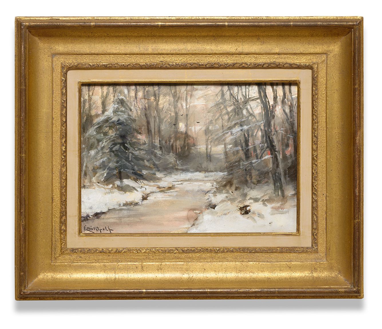 Louis Apol werd in Den Haag geboren en met uitzondering van de jaren 1886 – 1892 die hij in Velp doorbracht, zou hij daar altijd blijven wonen. Als schilder van voornamelijk besneeuwde bosgezichten en landschappen maakte Apol in 1880 deel uit van een wetenschappelijke expeditie naar Nova Zembla op Spitsbergen en kwam ervan terug met een grote hoeveelheid schetsen, tekeningen en aquarellen. Naar aanleiding van deze reis maakte hij een “panorama” van Spitsbergen: zijn schilderingen werden gebruikt als achtergrond voor opgezette ijsberen en zeehonden. Panorama’s waren geliefd bij het grote publiek aan het begin van de 20ste eeuw. Helaas was dit panorama maar tijdelijk en is het weer afgebroken. Met zijn specialisme van winterlandschappen voegde Apol zich bij een oude Hollandse traditie die begon bij Hendrik Averkamp. Apol richtte zich nog meer op de landschappelijke stemming van het beeld; de illusie van koude en weidsheid, van flonkerende of dreigende lucht en sneeuw dan zijn voorgangers. Met zijn licht en zijn brede penseelstreek laat hij mooi Hollands impressionisme zien. Met regelmaat werden zijn winterlandschappen bekroond. Al in de jaren ‘50 van de 19e eeuw trokken kunstenaars, meestal uit Den Haag, naar Oosterbeek om daar in de vrije natuur te gaan schilderen. Hier ontstond een schilderskolonie, in navolging van de schilders in het Franse Barbizon. De kunstenaars wilden een eind maken aan de romantische manier van kijken naar de natuur, door deze zo ‘eerlijk’ mogelijk te benaderen. Ze stelden hun composities niet langer samen in hun atelier, maar legden hun ervaring direct vast, buiten in de natuur. Willem Roelofs, die al eerder in Barbizon was geweest, vestigde zich als een van de eersten in Oosterbeek, gevolgd door Paul Gabriel, Anton Mauve en de broers Maris. Hier legden ze de basis voor een nieuwe stroming in de Nederlandse schilderkunst: de Haagse School. Apol voegde een nieuw facet toe aan die stroming: hij werd de ‘winterschilder’ van de Haagse School. Zijn werk is terug te vinden in verschillende Nederlands musea, de collectie van het Koninklijk Huis en vele particuliere verzamelingen in binnen- en buitenland.