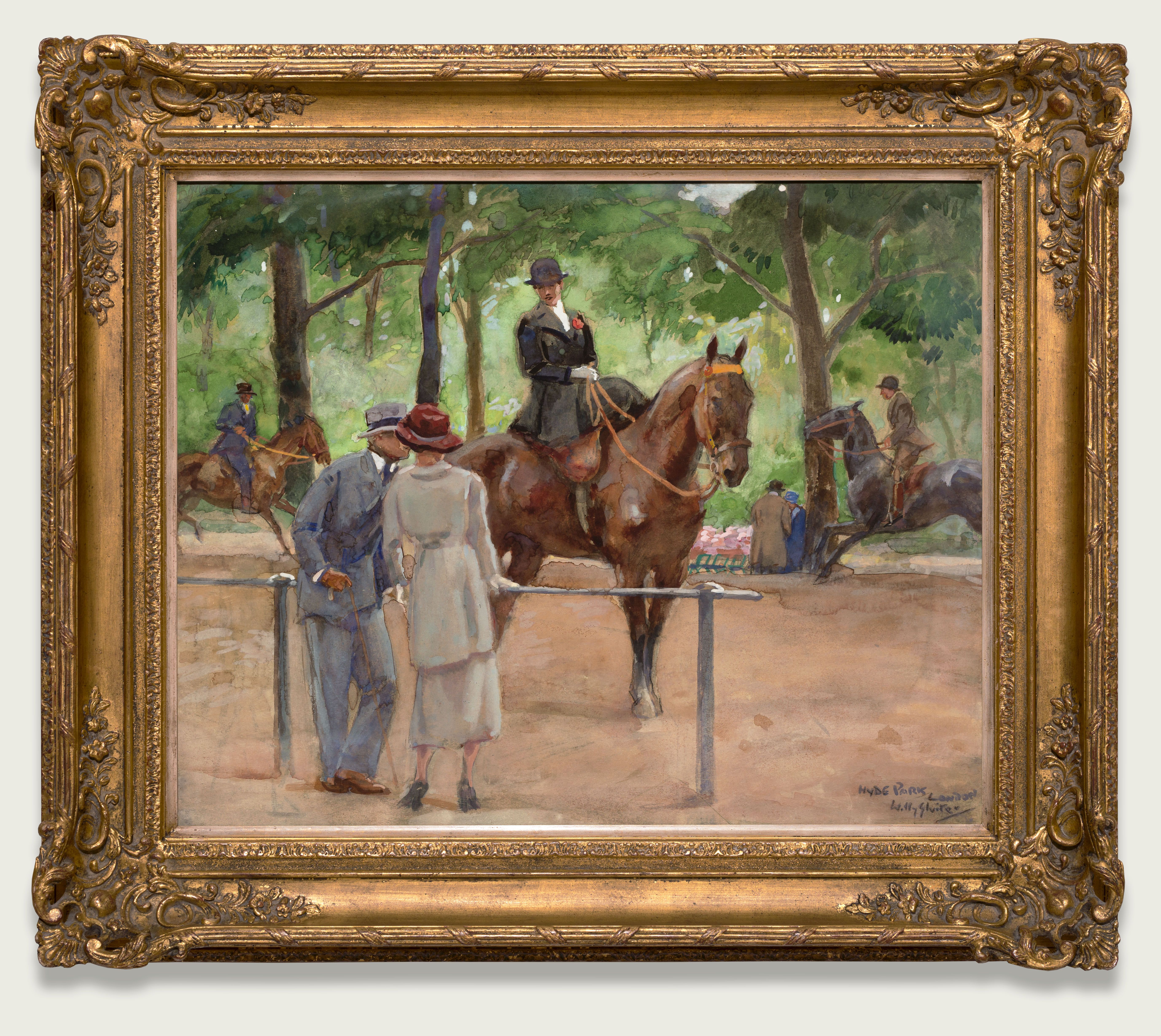 Al sinds het begin van de negentiende eeuw was Rotten Row een breed zandpad langs de zuidzijde van het Londense Hyde Park, dé plek om te zien en gezien te worden. Deze weg wordt nog altijd gebruikt als ruiterpad en vormt een bijzondere locatie, waar de gegoede standen zich temidden van de drukte in het centrum van Londen, al eeuwenlang ontspannen met paardrijden. Op deze mondaine ontmoetingsplaats voor welgestelde en notabele Londenaren maakte Willy Sluiter deze aantrekkelijke en kleurrijke pasteltekening.