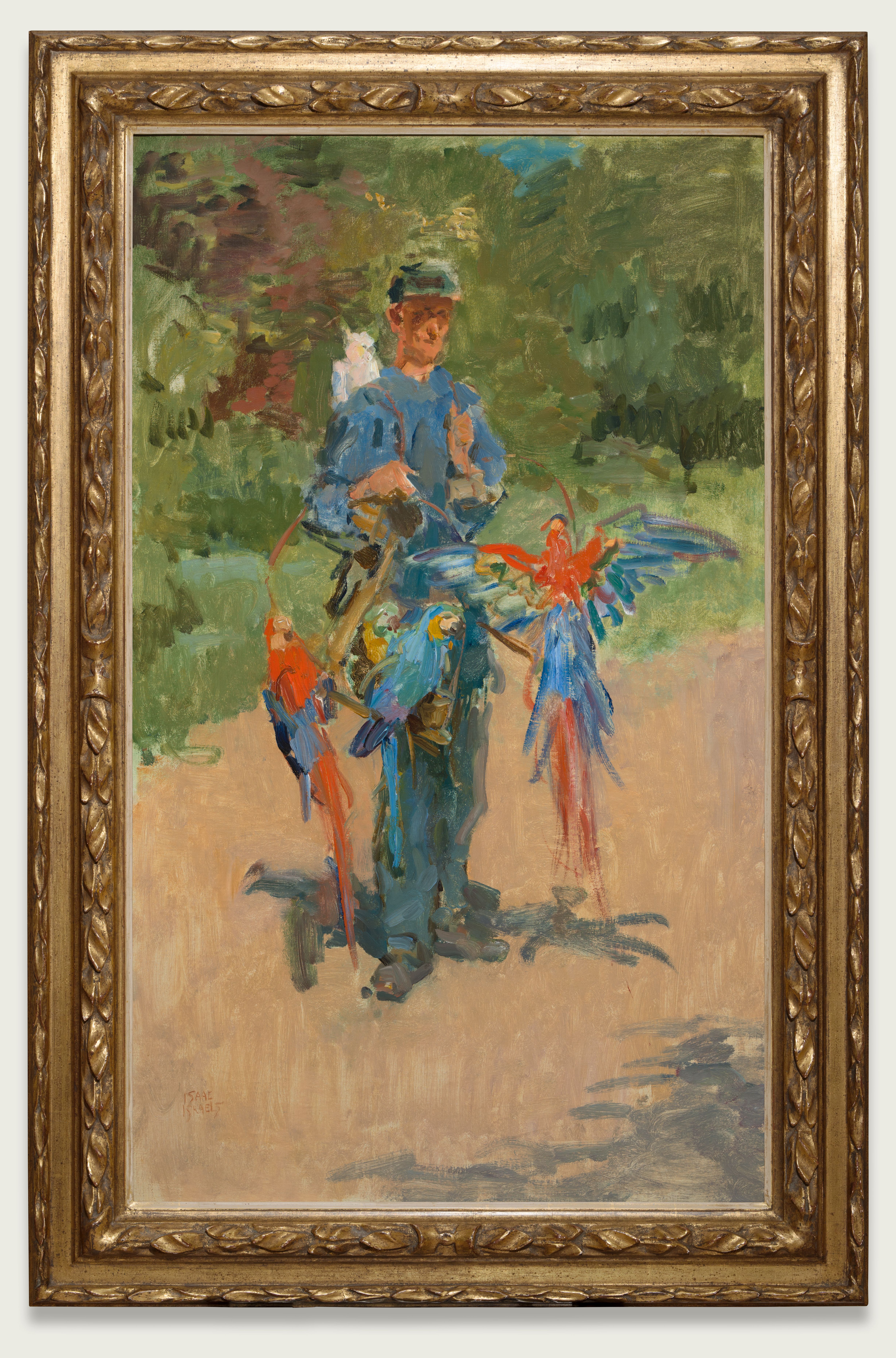In 1862 had ook Den Haag een eigen dierentuin gekregen, na Amsterdam en Rotterdam. De Haagse Dierentuin was gevestigd aan de overkant van de Koninginnegracht, tegenover het huis van Isaacs vader Jozef Israels. Toen hij later, lang na de dood van zijn vader, in zijn ouderlijk huis was gaan wonen en werkte in het atelier van zijn vader, was hij vaak in de dierentuin te vinden. De tuin werd een plek van vertier voor alle milieus, zeldzaam in de 19de-eeuwse standenmaatschappij. Zowel voor de middenklasse als de hogere standen was een dagje dierentuin een populair uitje waarvoor men zich op z’n zondags kleedde. Bij de ingang begon de papegaaienlaan, waar de vogels de bezoekers welkom heetten met een Haags accent. De oppasser, de heer Ponsen, maakte er een show van als hij zijn papegaaien aan het eind van de dag terugbracht naar hun kooi. De zonovergoten laan was een ideaal onderwerp voor Israels, de oppasser met al zijn verschillende vogels een feest van kleur. Met slechts enkele effectieve penseelstreken suggereerde hij op virtuoze wijze het geflapper van de kleurige vleugels en staart van de roodblauwe ara. De schilder Simon Maris schreef er over: “’t is of de beesten je doof schreeuwen. Israels wordt met den dag jonger.” Israels maakte verschillende versies van dit schilderij.