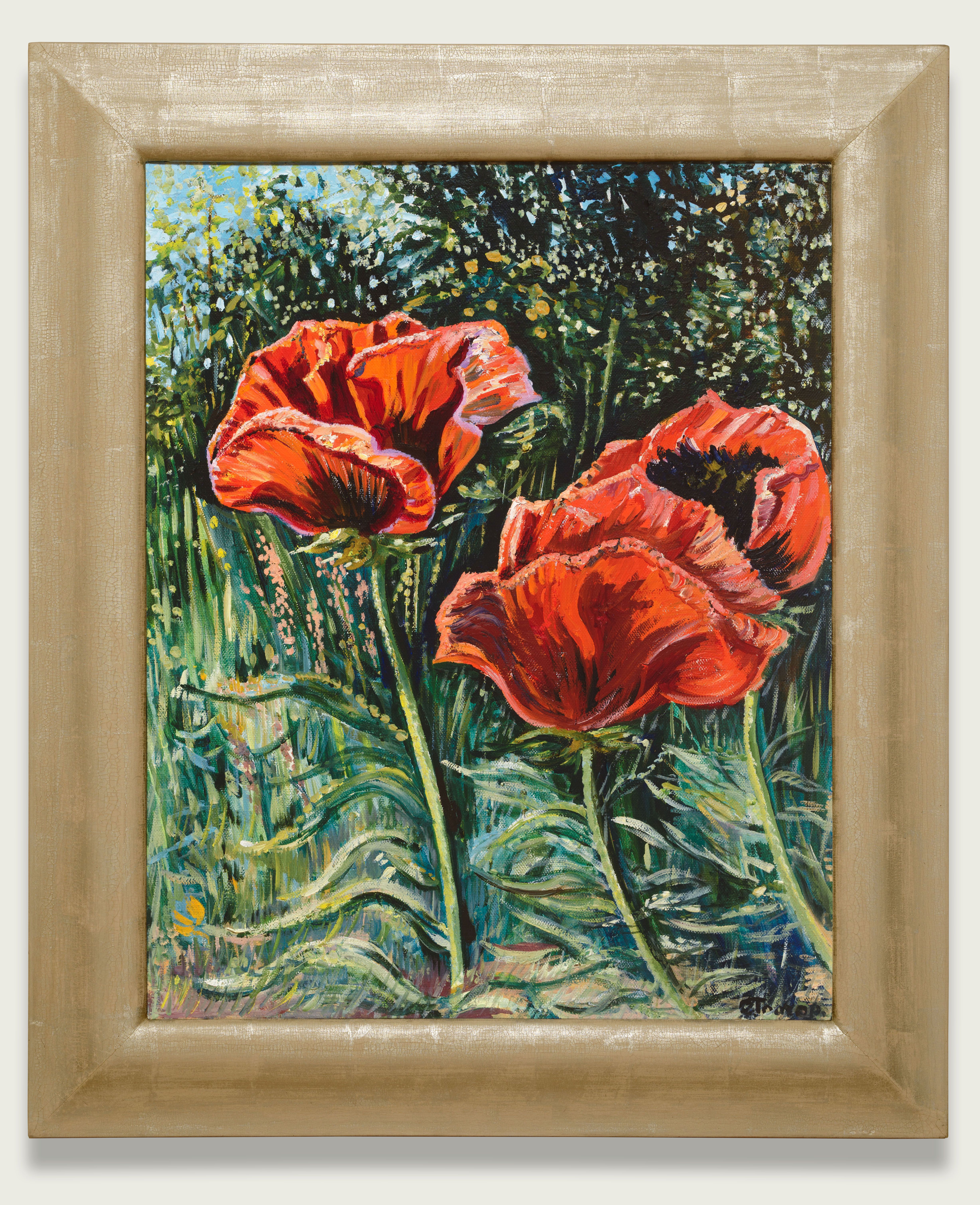 Op het schilderij Papavers zijn drie bloemen in close-up weergegeven. Ze vullen het beeldvlak volledig, tegen de achtergrond van een bosje. We zien zelfs een stukje lucht. Toch lijkt er nauwelijks ruimte in het schilderij. De diepe, verzadigde roden van de papavers steken fel af tegen de koelere, vaak blauwige of grijsgroene achtergrond. Dit kleurcontrast vergroot de intensiteit van de voorstelling en trekt de blik onvermijdelijk naar de bloemen. Het spel tussen warme en koele tonen versterkt het gevoel van diepte en maakt dat de papavers bijna tastbaar naar voren komen. Het is een portret van drie papavers, intens zoals de portretten waarmee Charley Toorop bekend is geworden.