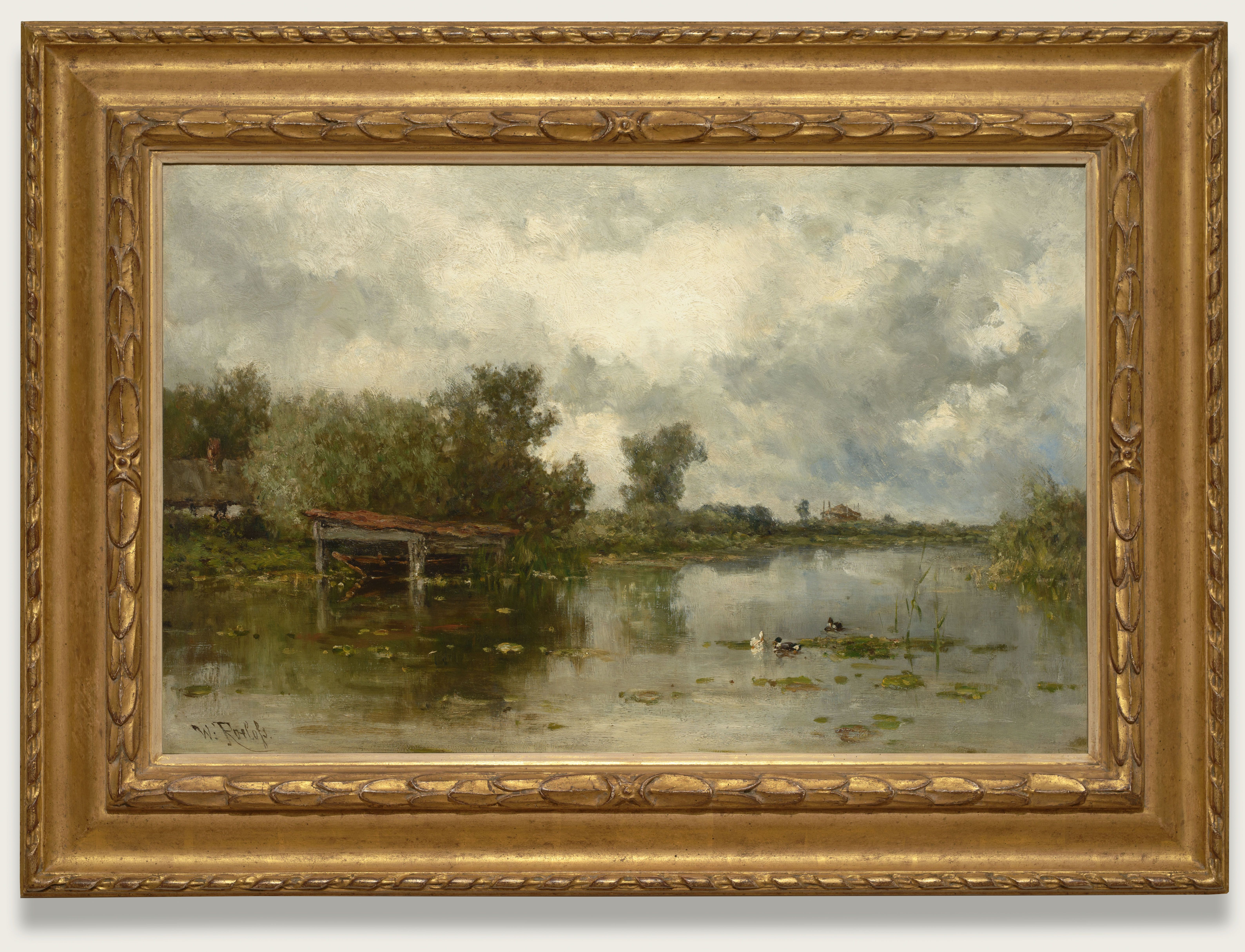 De beoogde eenheid tussen landschap en lucht komt in het hier afgebeelde schilderij magnifiek tot uitdrukking. De koeien doen zich te goed aan het water uit de plas waarin zij staan. Hun huiden glanzen door het zonlicht dat zich tussen de grijsblauwe wolkenpartijen laat zien, in het water en in delen van het landschap. Aan de overzijde, op het tweede plan, staan een bovenkruier en een boerderij. In het verschiet is de subtiele overgang te zien van het optisch grijs van de horizon naar het lichtere grijs van de lucht. De laatste tien jaren van zijn leven woonde Roelofs weer in Den Haag. Kort voor zijn overlijden vertrok hij weer richting Brussel, maar zou daar niet arriveren. Halverwege Brussel zou hij bij familie in Berchem bij Antwerpen overlijden.