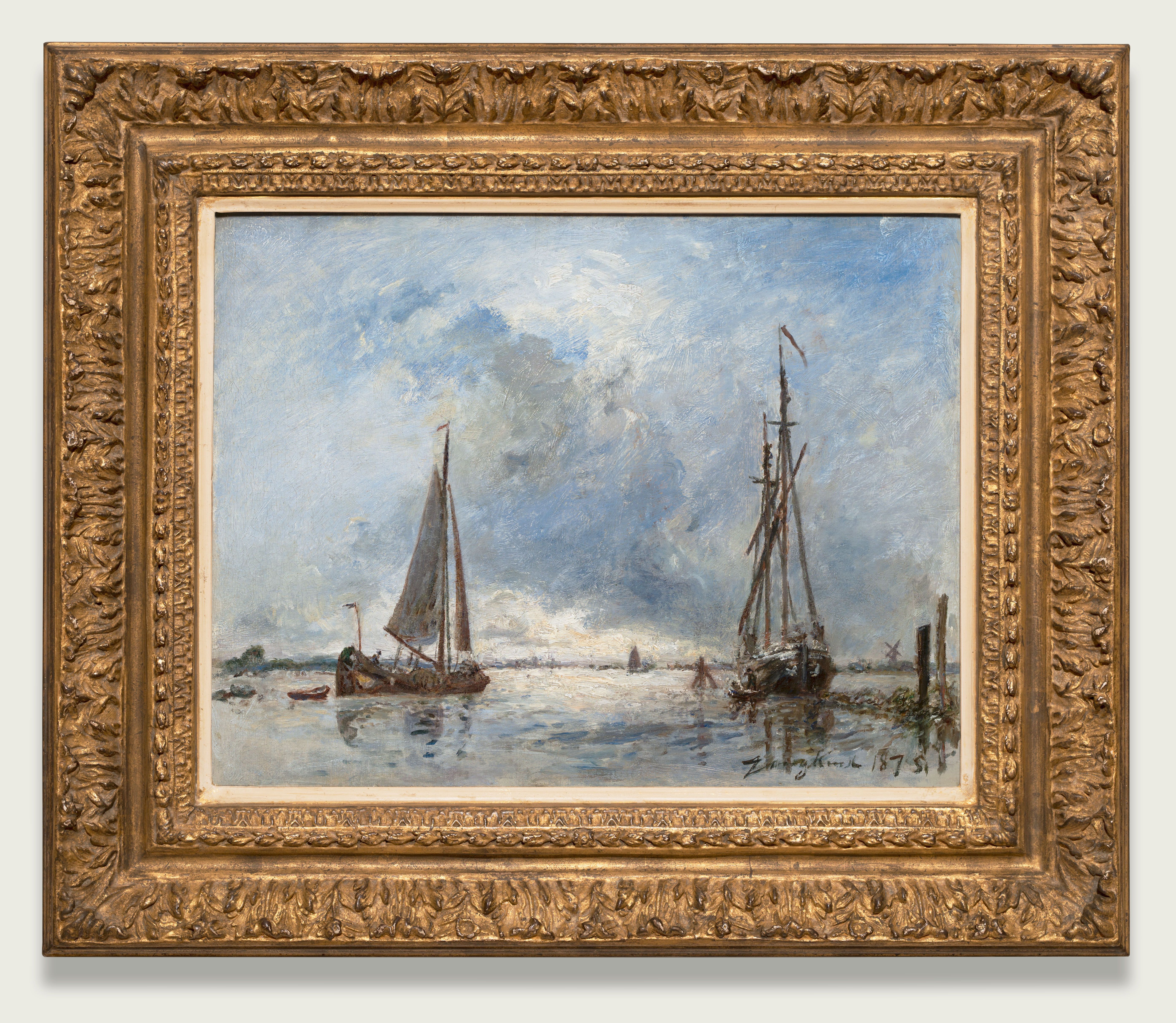 De drukke haven van Rotterdam, gereduceerd tot twee scheepjes op een eindeloze spiegelende watervlakte. Water en lucht, de twee voornaamste ingrediënten van de Hollandse landschapsschilderkunst domineren dit schilderij. Het is typisch Holland weer, zo’n dag waarop zon en regenbuien elkaar afwisselen. Het lijkt grijs, maar als de zon even doorbreekt is de wereld vol van kleur. De lucht beslaat het grootste deel van het schilderij, al zijn de lucht en het water nauwelijks van elkaar te onderscheiden. In de verte zien we aan de horizon een molentje dat er geen twijfel over laat bestaan dat we ons in Holland bevinden. Het is geen wonder dat water zo’n belangrijke rol speelt in het werk van Jongkind, de schilder van ons schilderij. Hij groeide op in Vlaardingen en Maasluis, in een waterrijk deel van Nederland. In die tijd werden de kunstenaars in hoge mate geïnspireerd door het werk van hun voorgangers uit de zeventiende eeuw. Grote zeventiende-eeuwse kunstenaars als Jan van Goyen en Aelbert Cuyp schilderden boten op de rivier onder Hollandse wolkenluchten en de negentiende-eeuwse kunstenaars deden het hen na. Toch is dit werk van Jongkind heel anders dan dat van zijn tijdgenoten. Hun gladde, heldere manier van schilderen verving hij door een veel expressievere stijl. Zijn werk is minder gedetailleerd, maar heeft veel meer sfeer. Op ons schilderij kunnen we elke penseelstreek zien, vaak kriskras door elkaar neergezet. Met een virtuoze, vlugge, maar rake techniek gaf hij de atmosferische omstandigheden, zoals mist, regen, het zonlicht door de wolken en de weerspiegeling op het water weer. De steeds veranderende omstandigheden waren voor hem een constante uitdaging en bron van inspiratie. De titel van ons schilderij maakt dat nog eens duidelijk: De Maas in Rotterdam bij regen.