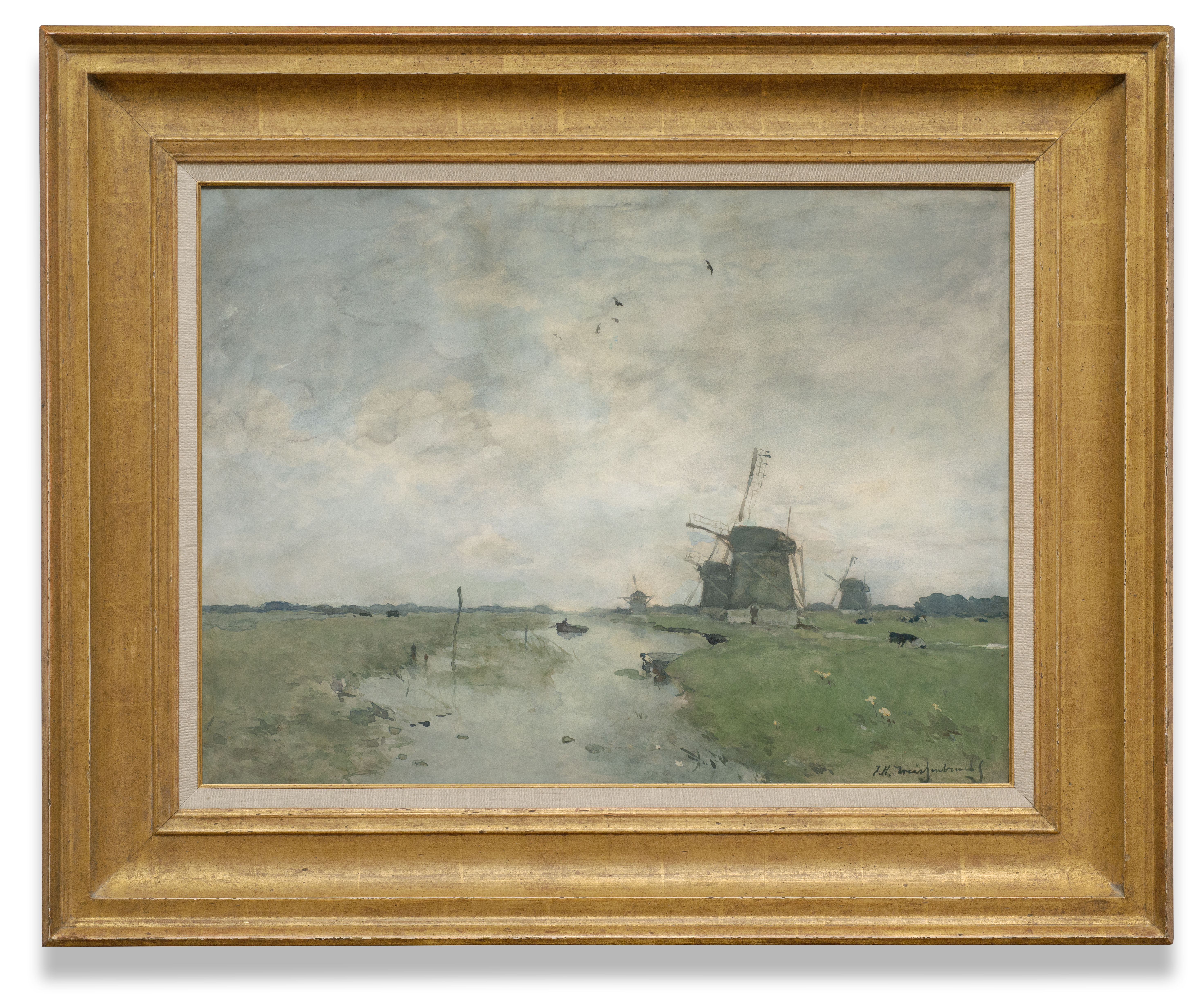 Jan Hendrik Weissenbruch werd geboren in Den Haag. Vanaf zijn 16de kreeg hij tekenlessen en later volgde hij de avondklas op de Haagse academie. Zijn vader was amateur-schilder en verzamelde werk van schilders als Andreas Schelfhout. Zijn zoon zal echter geen les gekregen hebben van Schelfhout op aanraden van de schilder J.Bosboom die vond dat Weissenbruch zelf moest leren kijken. Schelhout was ook wars van de modernere losse manier van schilderen die toen opkwam. J.H. Weissenbruch wordt algemeen beschouwd als één van de van de belangrijkste schilders uit de Haagse School, de schilder van het groene hart van Holland, zoals dat er rond 1900 uit zag. Hemel en aarde, dat zijn thema’s. “Licht en lucht zijn de grote tovenaars’” zei hij, “Zowel grijze regenluchten als heldere wolkenluchten op een zomerse dag”. “Schilders kunnen nooit genoeg naar de lucht kijken”. In 1900 gaat Weissenbruch naar Barbizon, zijn enige buitenlandse reis, een soort bedevaart om eens en voor altijd te ontdekken waar de grote invloed op de Haagse School vandaan kwam.Het naar de natuur schilderen en de oorsprong van het “plein air” schilderen ontdekken. Weissenbruch komt regelmatig voor in de brieven van Vincent van Gogh aan zijn broer Theo. Met bewondering wordt er door beide over W. of “de vrolijke Weiss” geschreven. Als geen ander weet Weissenbruch het zo typische Hollands licht weer te geven zowel in olie als in aquarel.