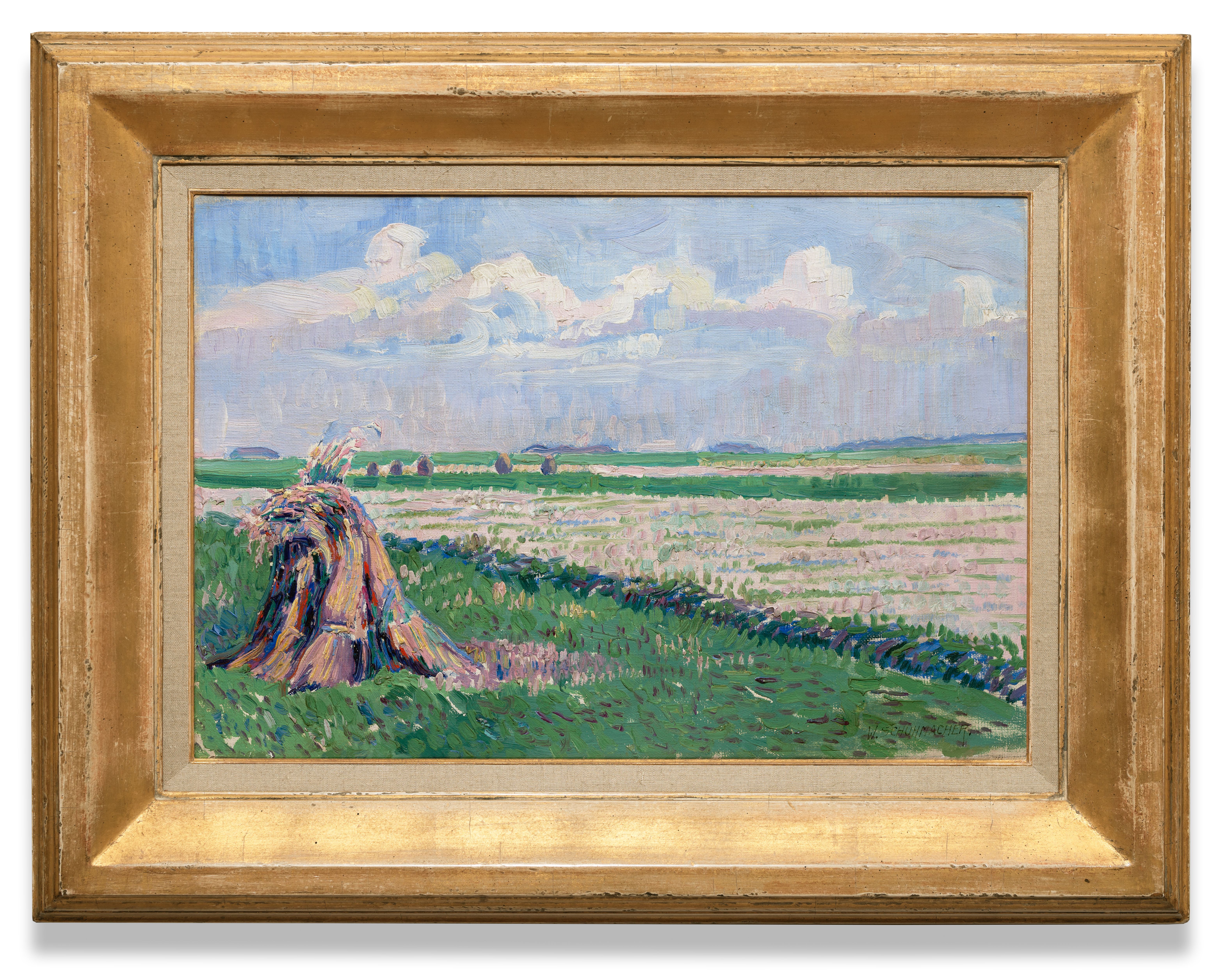 Initially Wim is educated as a house painter at the Crafts School in Amsterdam. He then becomes the assistant of C.A. Lion Cachet and will work as a designer in addition to painter in his life. Throughout his life he travels extensively through Western and Southern Europe. After an expressionist initial period, he finds his way, through various related movements to (magical) realism. 'The master of gray' is his subtitle. Work by Schumacher can be found in all major modern collections of Dutch museums. The painting "Field with Wheat Sheaf" is dated 1914. Schumacher was living in Amsterdam at the time. This is an early work with clear influences of van Gogh combined with the prevailing Amsterdam luminism. Loosjes-Terpstra says about this time : the foreign influence on Dutch art was predominantly of French origin and " that through the impressionist starting point, one increasingly sought more intense, more powerful expression so that impressionism often turned to expressionism" ( Loosjes-Terpstra, Modern Art in the Netherlands 1900-1914, Utrecht 1959 pp.314-323) Both statements hold true for Wim Schumacher in this painting that demonstrates intense (separated) use of color.