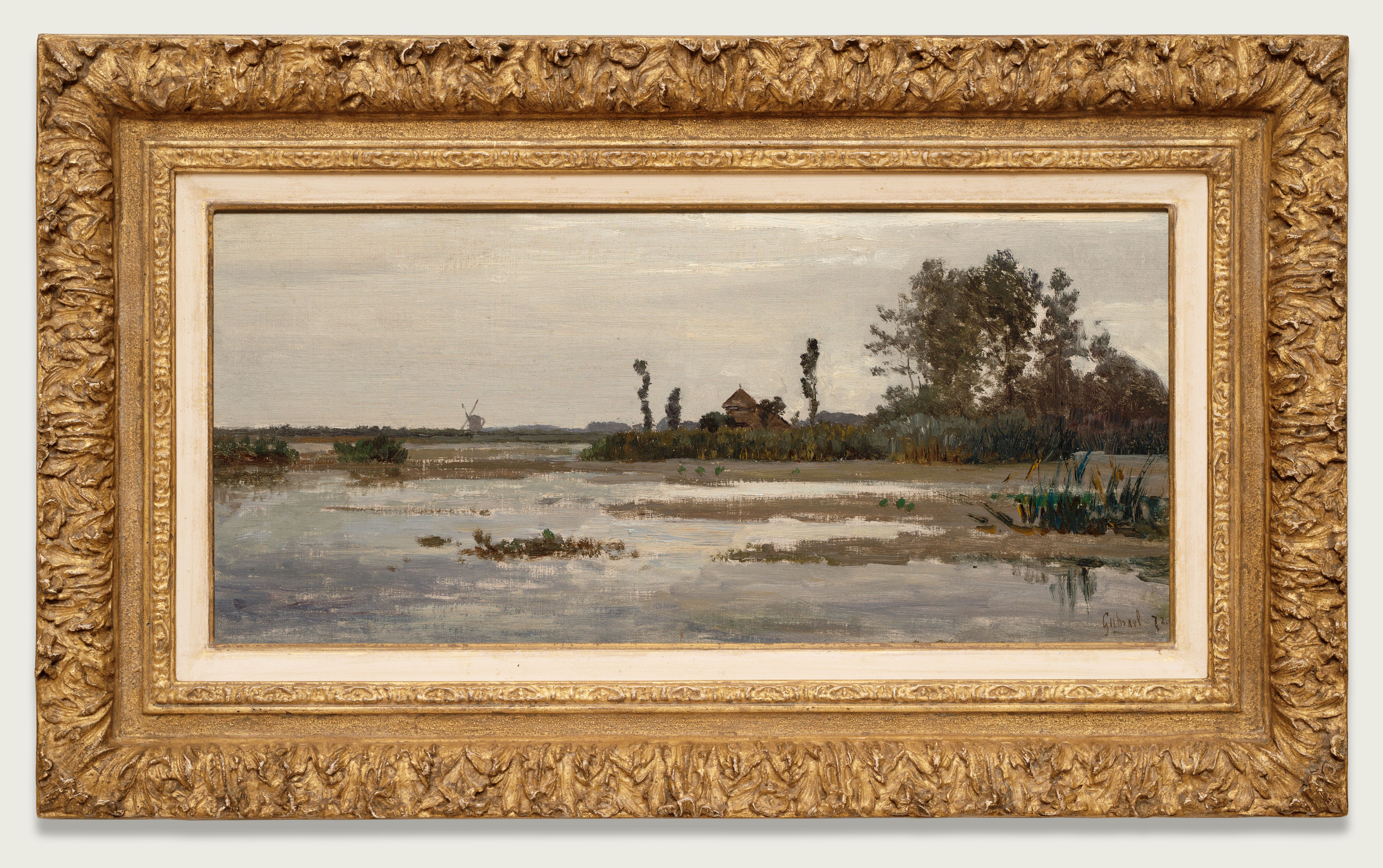 Paul Gabriel is pre-eminently characterized as the portraitist of the Dutch polder. He learned to paint en-plein-air in Oosterbeek, where he spent some time with J.W. Bilders, among others. In 1860 he moved to Brussels where he became friends with Willem Roelofs, the leading landscape painter at the time. From Brussels he regularly returned to paint the Dutch ponds and polders. The time of day (preferably early in the morning) and the corresponding light are important elements in Gabriel's work. In doing so, he uses more than just the nuances of gray so beloved of his contemporaries and was thus called the colorist of the Hague School. Mesdag calls it "Gabriel's morning poetry." Until the 1980s, Gabriel painted mainly in the area around Kortenhoef, Abcoude and Vreeland. After moving to Scheveningen in 1884, he works in the area around The Hague. Gabriel belongs to one of the leading painters of the Hague School. Almost all important museums own work by him.