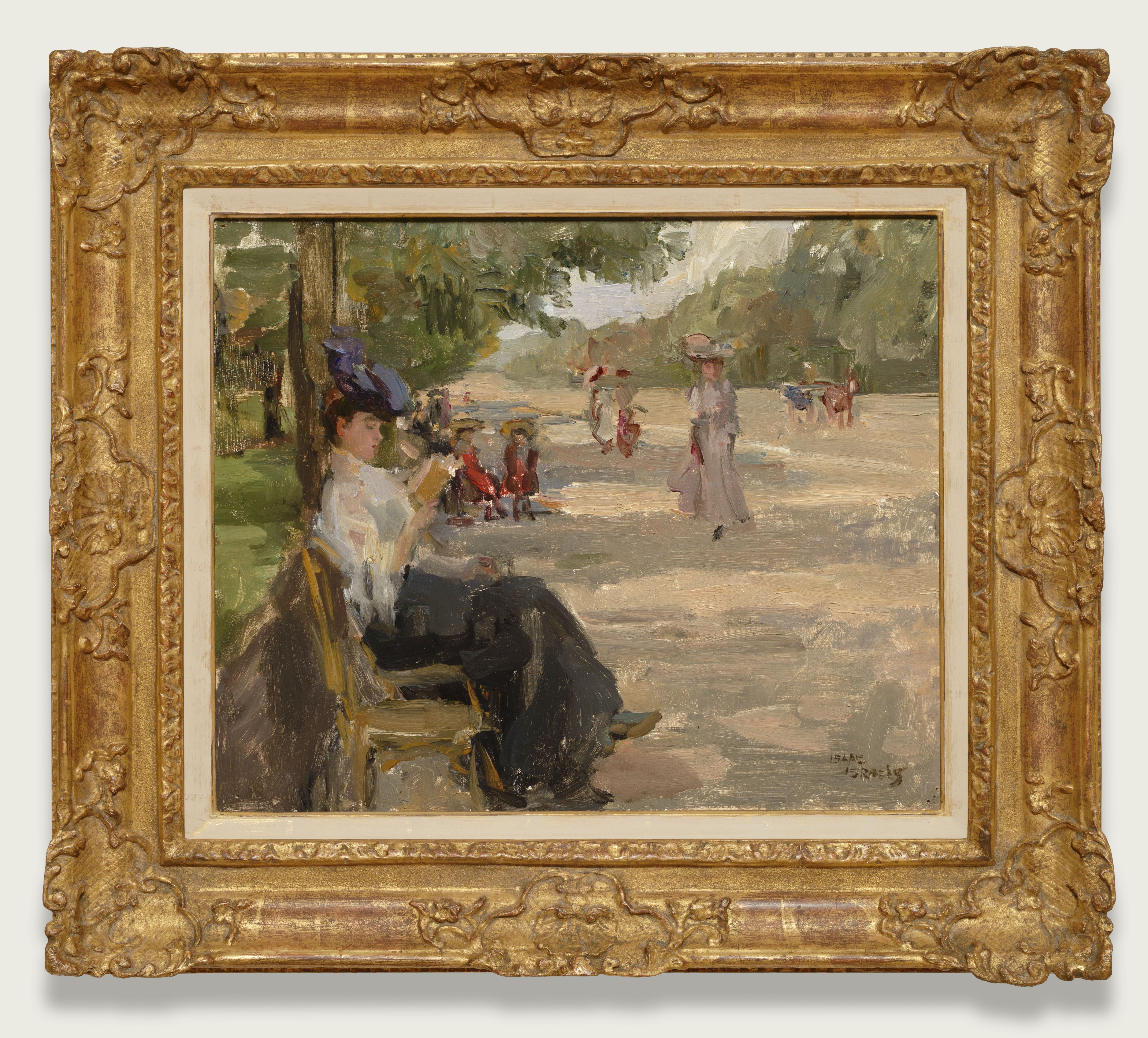 Isaac Israels was especially a painter of life in the big city. Paris, around 1900, the cultural capital of Europe, played a major role in his life. Seeking beauty in day-to-day reality was Israels’ mission and he became an expert in capturing an essence by a few broad brushstrokes. Our painting is a climax of Israels’ ripe impressionist style. We see a young lady reading a book on a bench in the shade of the trees on one of the broad lanes of the big city park Bois de Boulogne. The broad brushstrokes, combined with a subtle use of colours, are characteristic for Israels’ Parisian work. His ostensibly nonchalant style contributes to the relaxed atmosphere of a day in the park.