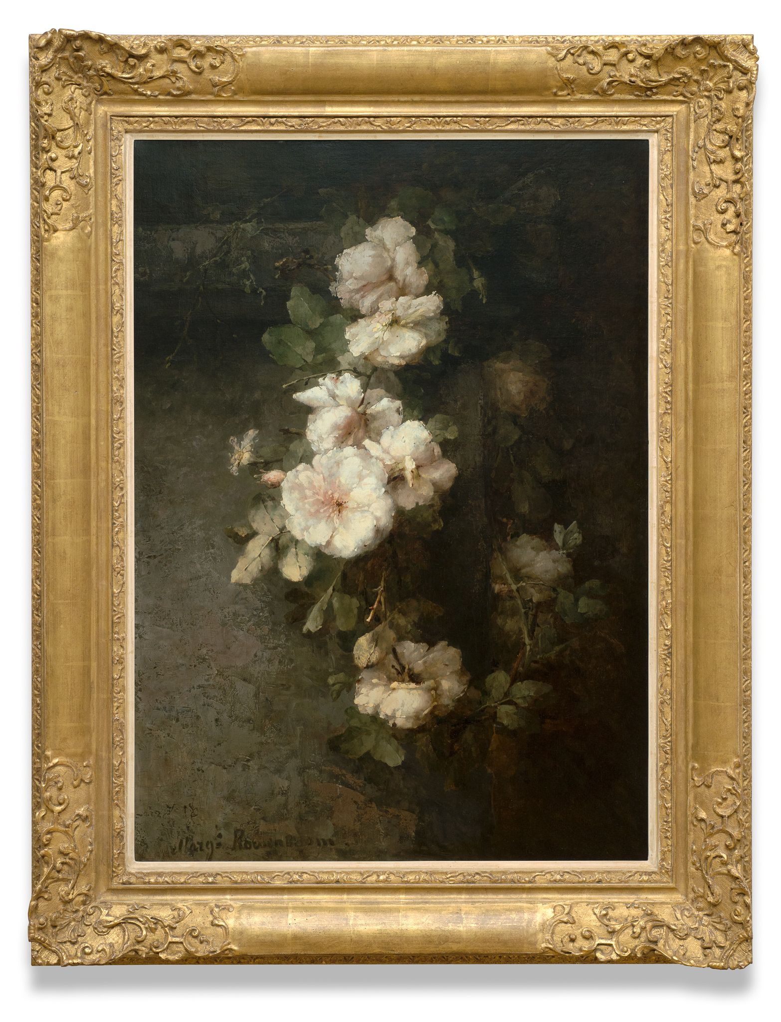 As was the custom at the time, Margaret Roosenboom was not admitted to the Academy. She received her first painting education from her father: landscape painter Nicolaas Roosenboom in Brussels. In 1867, she returned to The Hague to learn watercolor painting with her grandfather Andreas Schelfhout. She married the painter Johannes Gijsbertus Vogel at the age of 49. Early on, she specialized in flower and fruit still lifes. Her style of painting was accurate and later early impressionistic, in all cases very talented. Margaret Roosenboom's still lifes were innovative in her time. She broke with the time-honored, static traditions in this genre and introduced a more lively way of composition. She usually chose one kind of flowers and depicted them naturally with a loose brushstroke. Colors were carefully chosen: light tones against a dark background. She was a member of Pulchri and exhibited internationally. Her work won many awards. She died at the age of 53 due to an accident.
