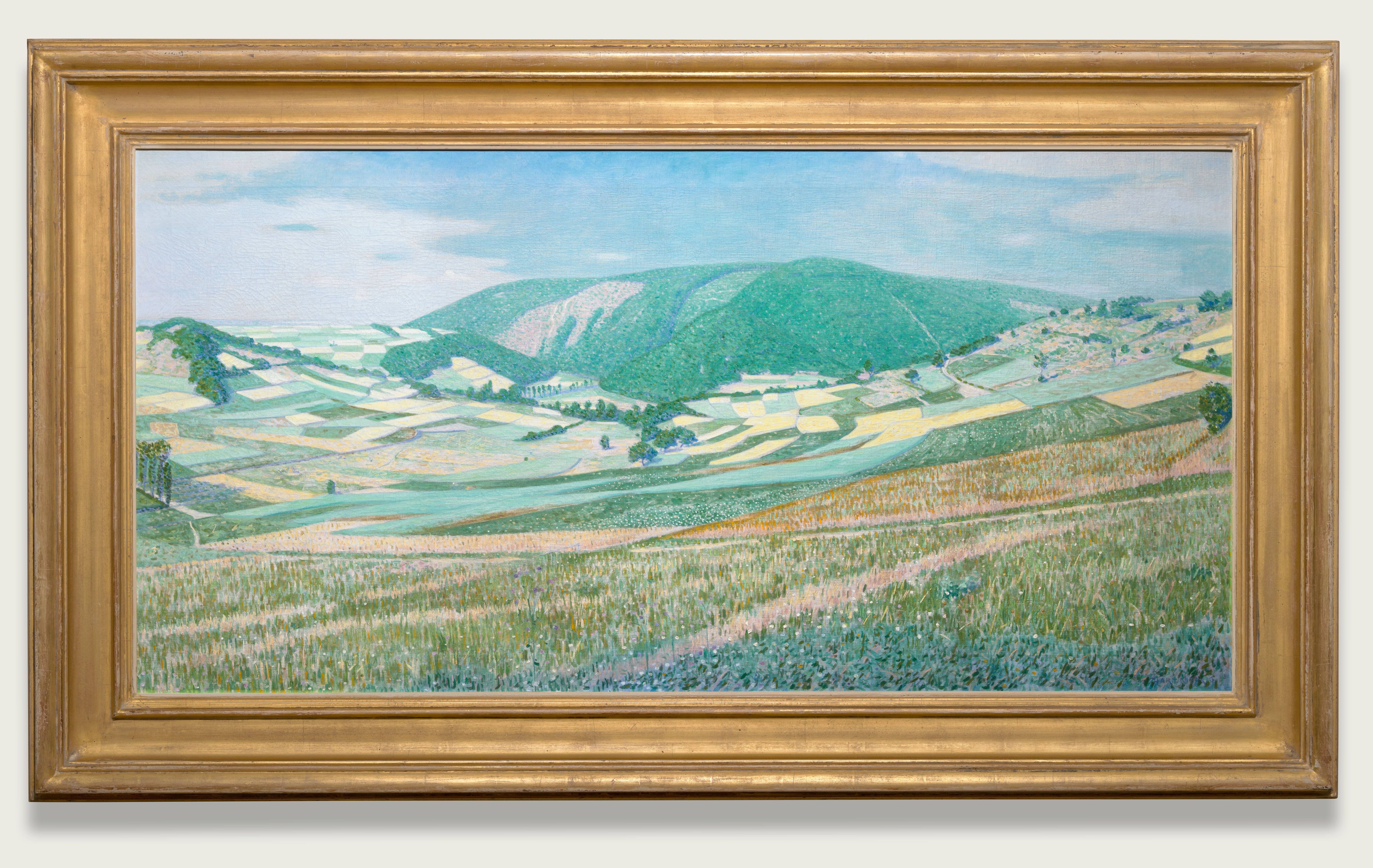 Ferdinand Hart Nibbrig wanted to paint the effect of light on the landscape. He always chose a spot with an endless view and painted it from an elevated position. The vast expanse has a panorama-like effect on the viewer, they feel absorbed in the landscape. This panoramic effect is enhanced by the lack of pictorial elements bounding the image on the left and right. The expanse seems infinite. The method of painting, with small dots and stripes, produces a bright, sparkling effect, ideally suited for capturing the sunlight on a landscape. Hart Nibbrig applied this technique rather undogmatically. In this painting, especially in the foreground, he used the pointillism realistically as well. Each blade of grass and each small flower seems individually painted.