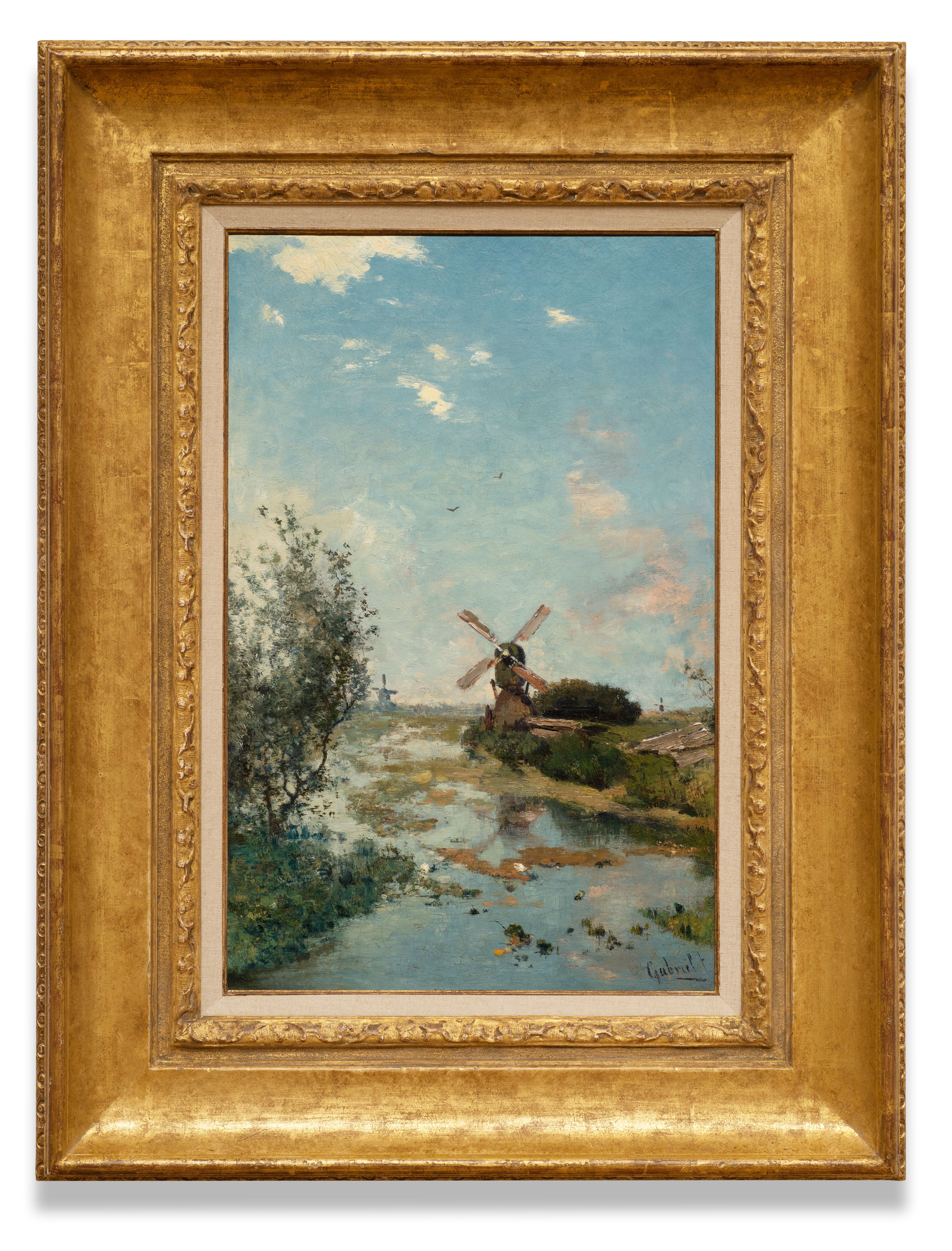 Paul Gabriel is pre-eminently characterized as the portraitist of the Dutch polder. He learned to paint en-plein-air in Oosterbeek, where he spent some time with J.W. Bilders, among others. In 1860 he moved to Brussels where he became friends with Willem Roelofs, the leading landscape painter at the time. From Brussels he regularly returned to paint the Dutch ponds and polders. The time of day (preferably early in the morning) and the corresponding light are important elements in Gabriel's work. In doing so, he uses more than just the nuances of gray so beloved of his contemporaries and was thus called the colorist of the Hague School. Mesdag calls it "Gabriel's morning poetry." Until the 1980s, Gabriel painted mainly in the area around Kortenhoef, Abcoude and Vreeland. After moving to Scheveningen in 1884, he works in the area around The Hague. Gabriel belongs to one of the leading painters of the Hague School. Almost all important museums own work by him.