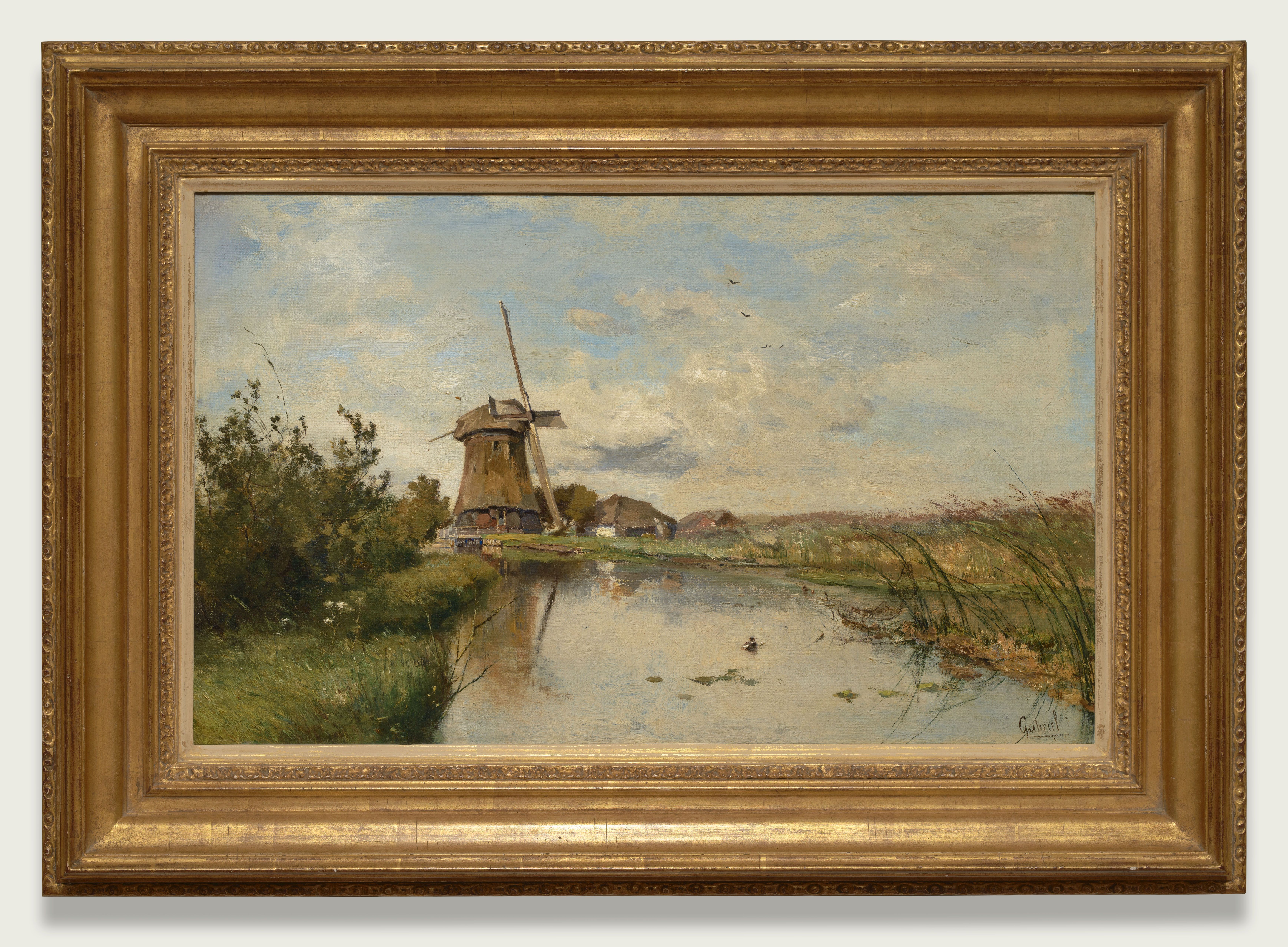Paul Gabriel is pre-eminently characterized as the portraitist of the Dutch polder. He learned to paint en-plein-air in Oosterbeek, where he spent some time with J.W. Bilders, among others. In 1860 he moved to Brussels where he became friends with Willem Roelofs, the leading landscape painter at the time. From Brussels he regularly returned to paint the Dutch ponds and polders. The time of day (preferably early in the morning) and the corresponding light are important elements in Gabriel's work. In doing so, he uses more than just the nuances of gray so beloved of his contemporaries and was thus called the colorist of the Hague School. Mesdag calls it "Gabriel's morning poetry." Until the 1980s, Gabriel painted mainly in the area around Kortenhoef, Abcoude and Vreeland. After moving to Scheveningen in 1884, he works in the area around The Hague. Gabriel belongs to one of the leading painters of the Hague School. Almost all important museums own work by him.