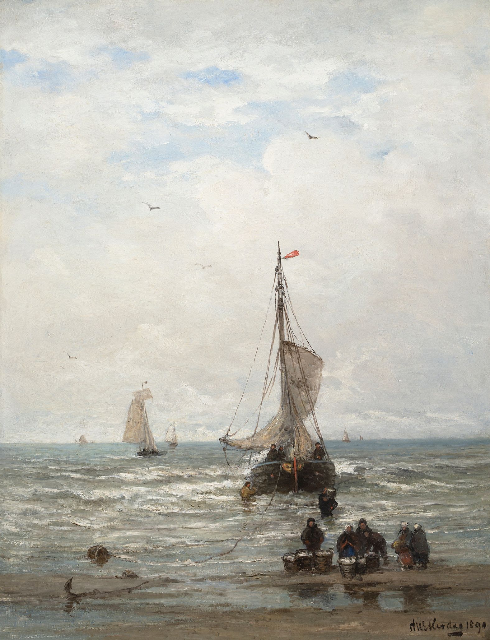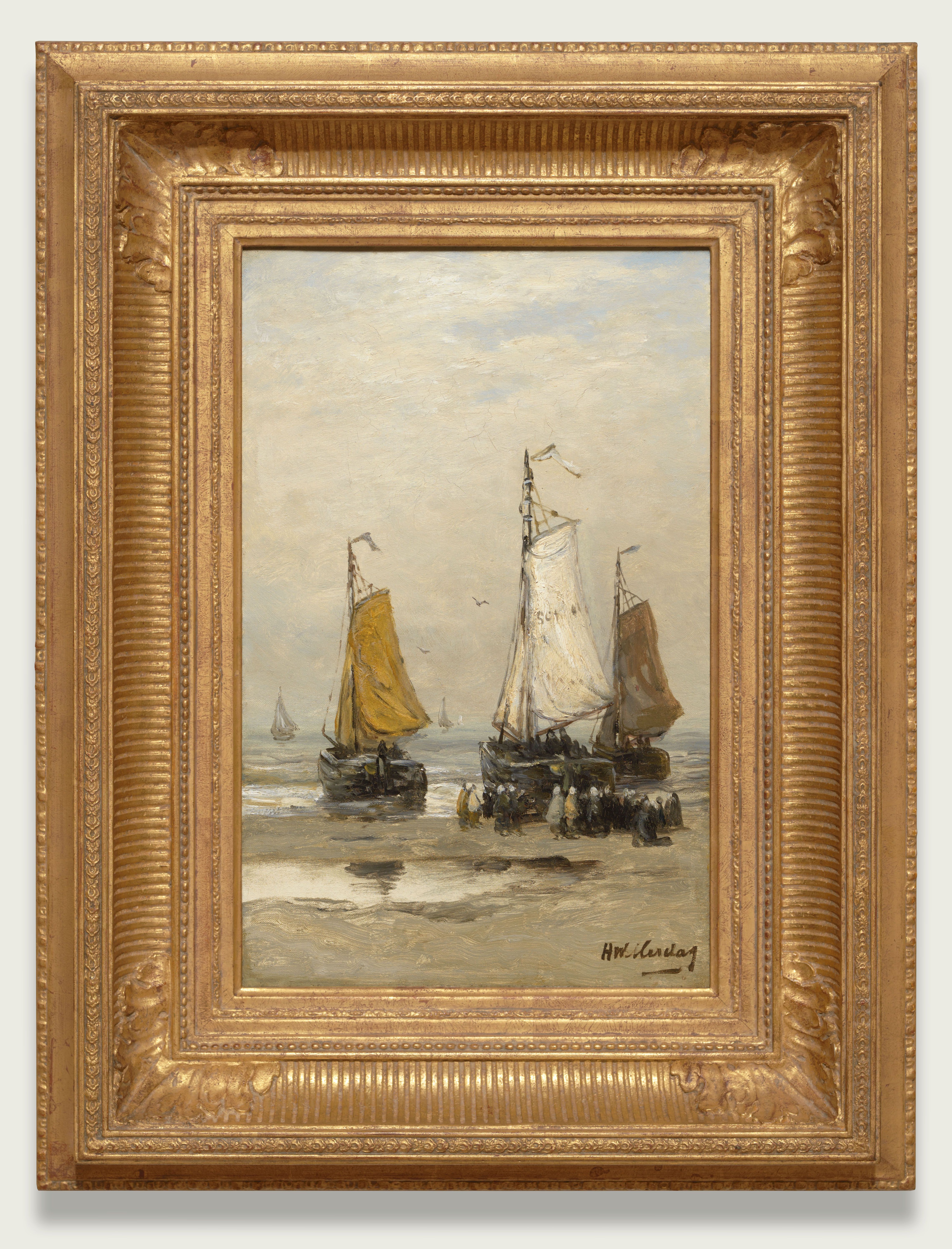 Three heavy traditional fishing vessels rest on the damp sands, their sails loosely furled, as a small crowd gathers around them. The tide is low, the sea calm, and the sky veiled in in a soft grey haze, with occasional patched of blue breaking through. With just a few broad brushstrokes and a muted palette, Hendrik Willem Mesdag captured not only the visual character of the Dutch coastline, but also its atmosphere - its timelessness.