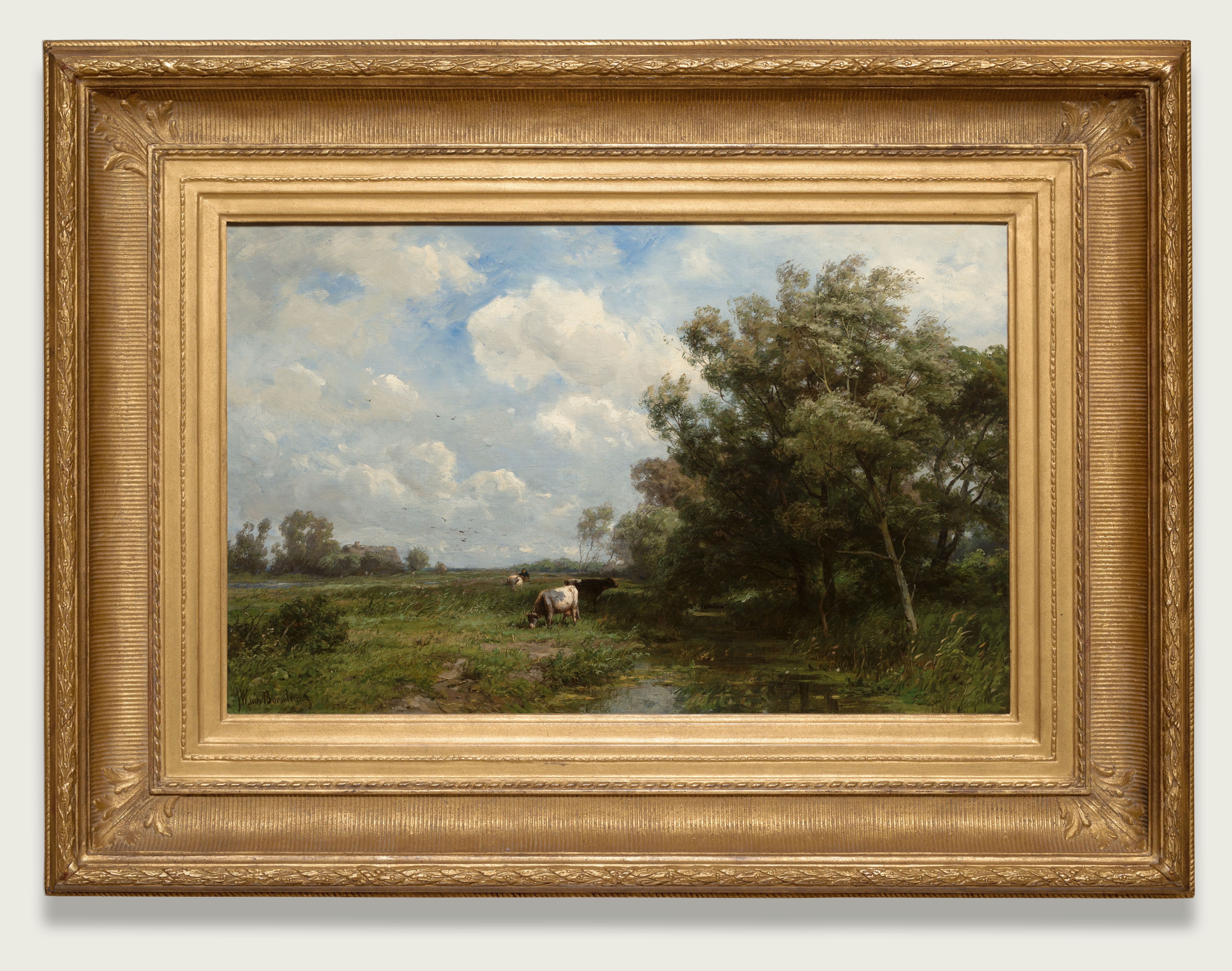 Landscape painting has a long tradition in the Low Countries. Van Borselen, known for his fresh and clear views of meadows and polders, learned this craft from none other than Andreas Schelfhout. Van Borselen's work marked the transition from the Romantic style to the looser approach like the Hague School. He did not belong to the Hague School although his later work contained clear elements of it. Like no other he could capture the wind through reeds and trees in his paintings: the title of the 2002 retrospective exhibition at the Stadsmuseum Woerden 'Wind and Willows'. He was a very successful artist, board member of Pulchri and one of the founders of the Royal Society of Watercolorists. He enjoyed the friendship of King Willem III. His work is included in the collections of the Museum Boymans van Beuningen in Rotterdam and the Frans Hals Museum in Haarlem. The Teylers Museum in Haarlem owns a number of watercolors.